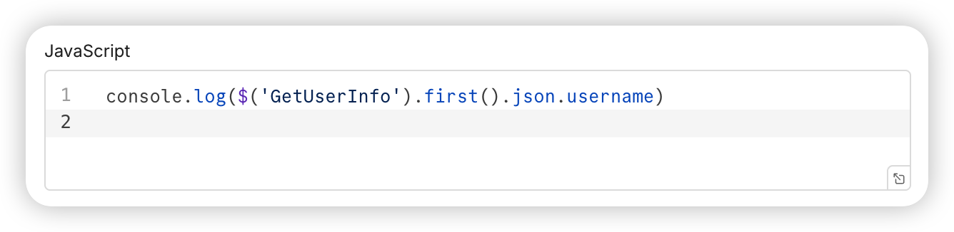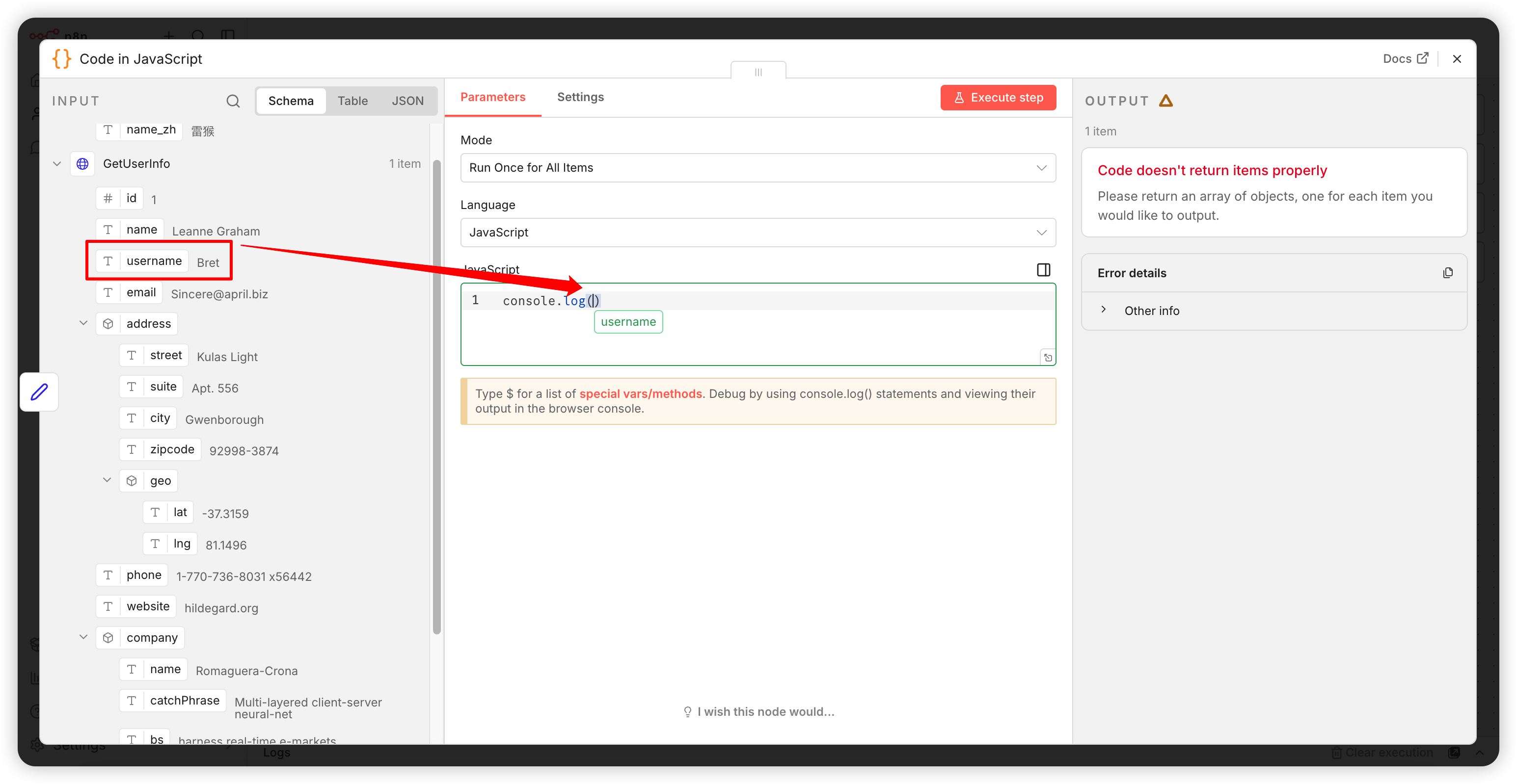 在最后的「代码节点」里要获取「GetUserInfo 节点」的数据只需要拖进来就行了。