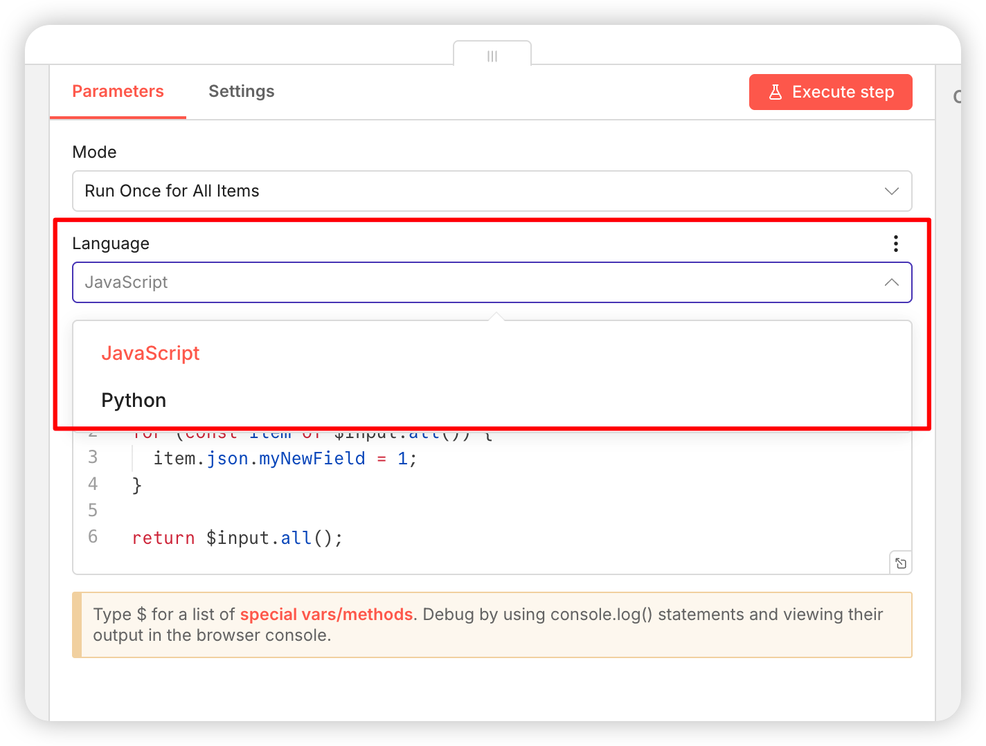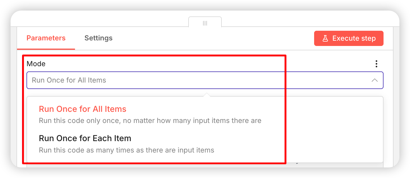 Run Once for All ltems:这是默认设置。当你的工作流程运行时,代码节点中的代码会执行一次,无论输入项多少。Run Once for Each Item:如果你想让代码对每个输入项目运行一次,就选择这个。