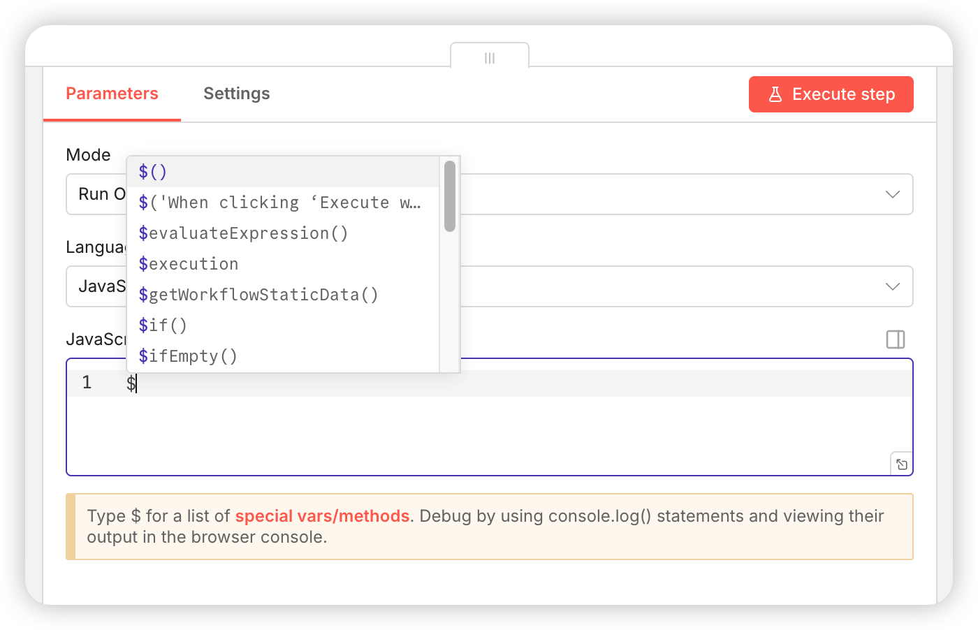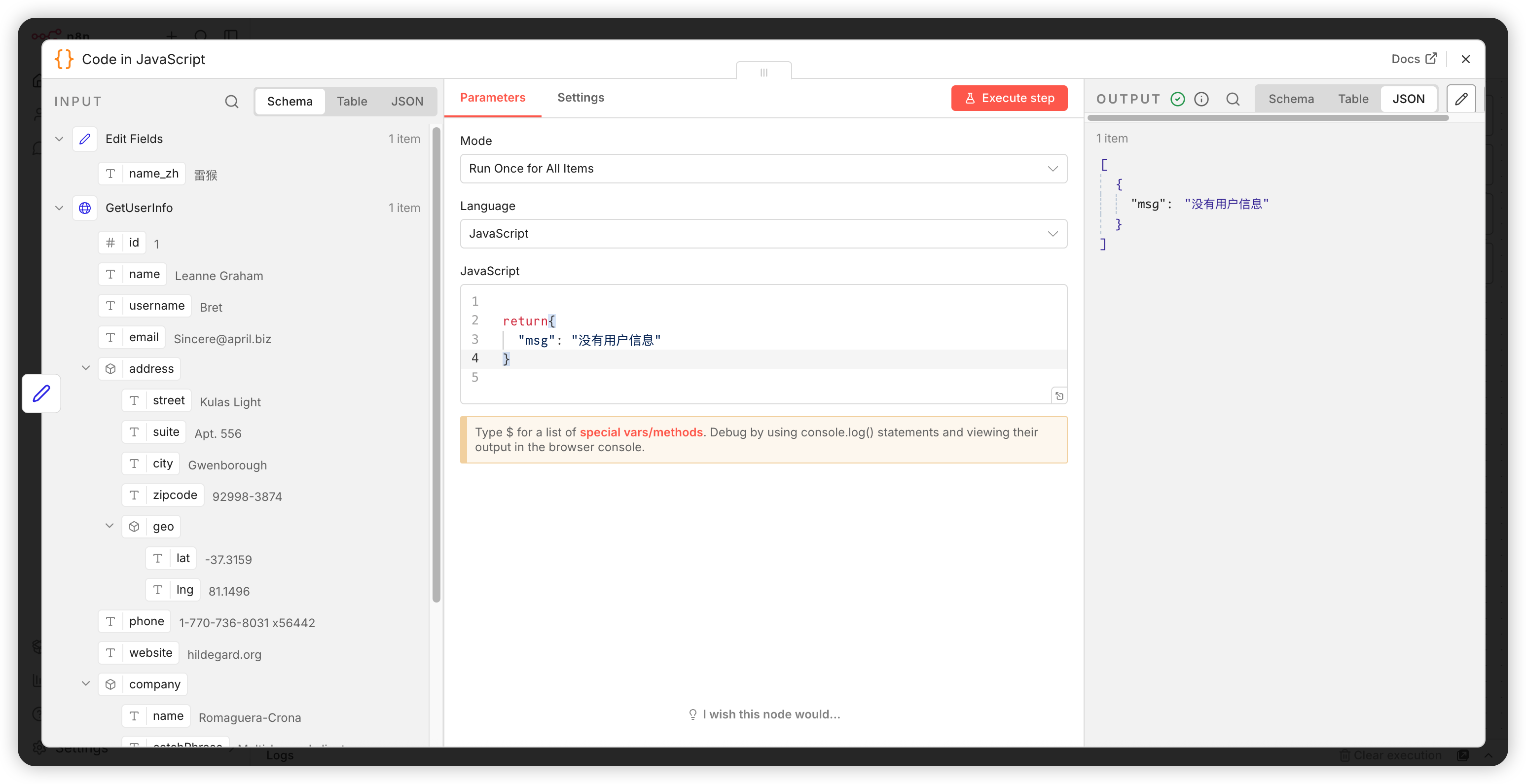 n8n 的代码运行环境提供了一些针对工作流常用到的内置函数和内置变量,它们能大大减少你的原生代码量。所以一定要多看 n8n 的官方文档。