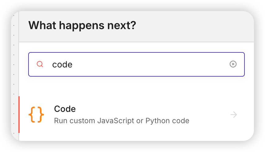 在 n8n 中可以搜索 code 就能找到「代码节点」。