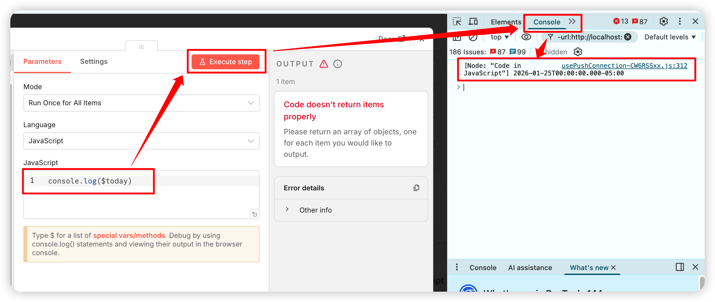 比如上面的 console.log($today),按 F12 打开浏览器控制台,切换到 Console 面板,点击运行代码就能看到控制台输出了对应的内容。