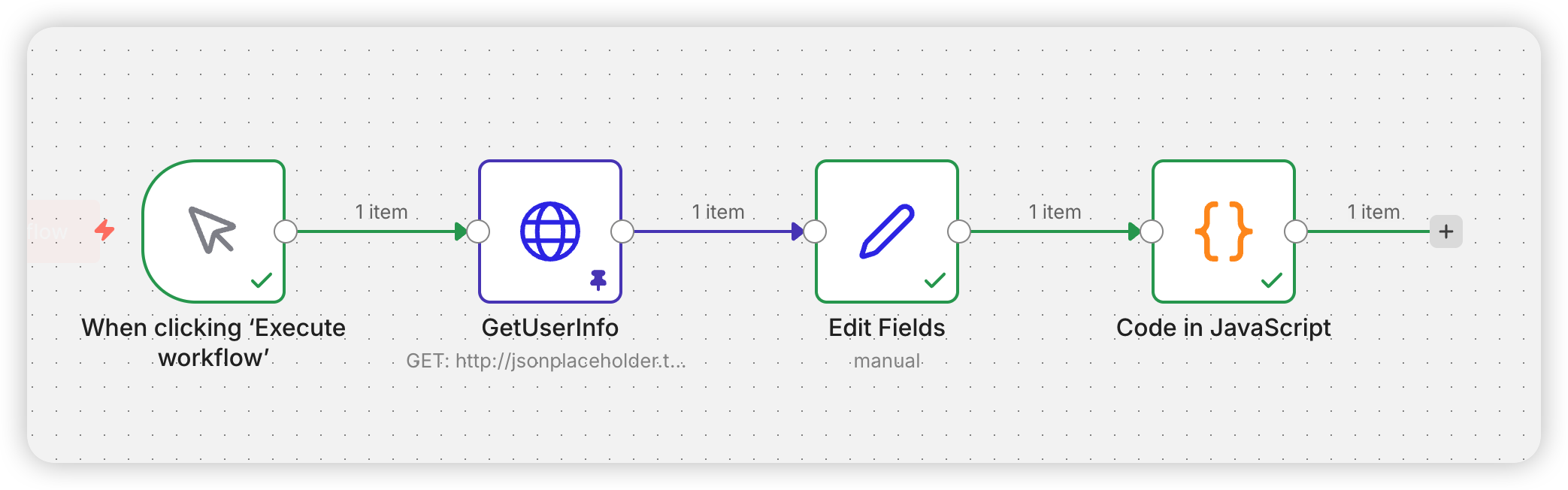比如我这个工作流,用「HTTP 节点」请求了一些数据,并且给这个「HTTP 节点」重命名为 GetUserInfo,然后再接一个「Edit Fields 节点」里面设置了一个 name_zh 数据。