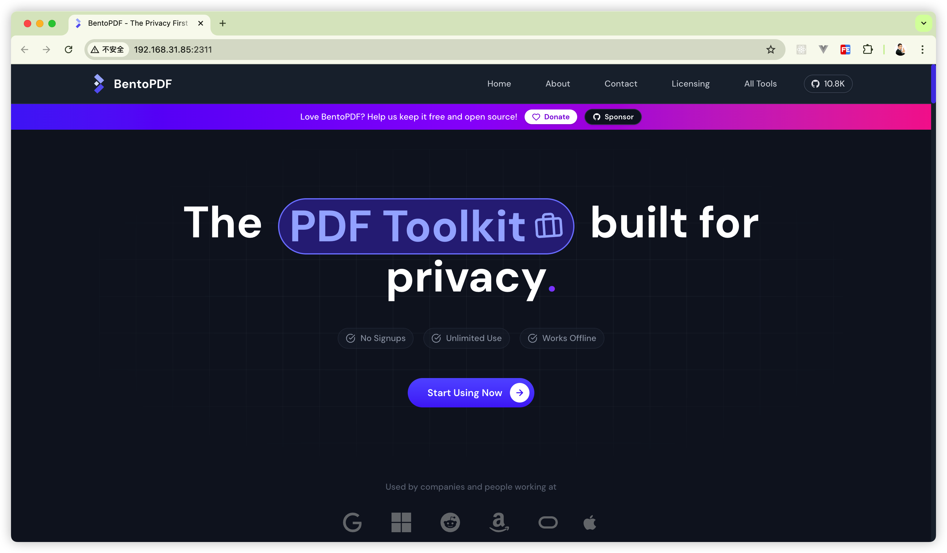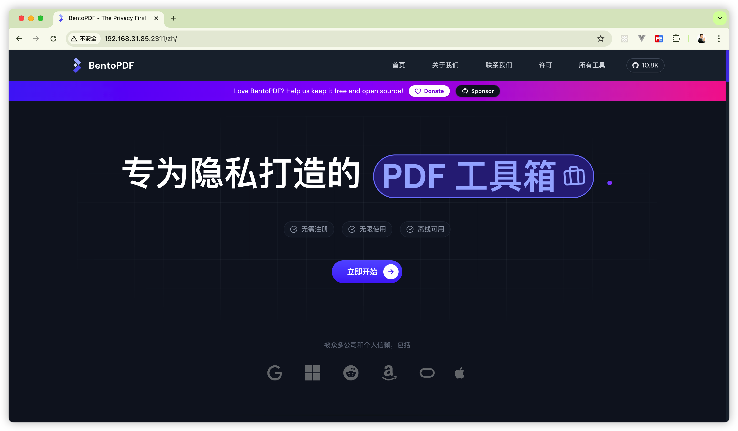 BentoPDF 是一款隐私优先、纯浏览器端运行的 PDF 全能工具箱,可通过 Docker 轻松部署到 NAS。提供数十种处理 PDF 功能,所有文件处理均在本地完成,无大小 / 数量限制、无水印、完全开源免费,无需担心隐私安全与付费套路。