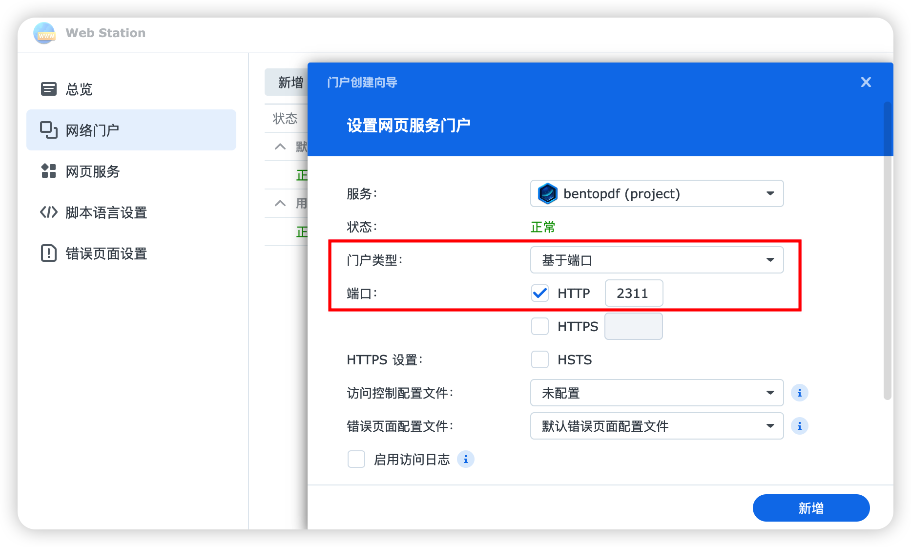 填入以下内容。如果发现部分功能无法使用,可以勾选 HTTPS,给它创建要给端口,在浏览器就使用 https 的方式访问。我这里只给 http 设置了 2311 端口,你根据自己需求配置。