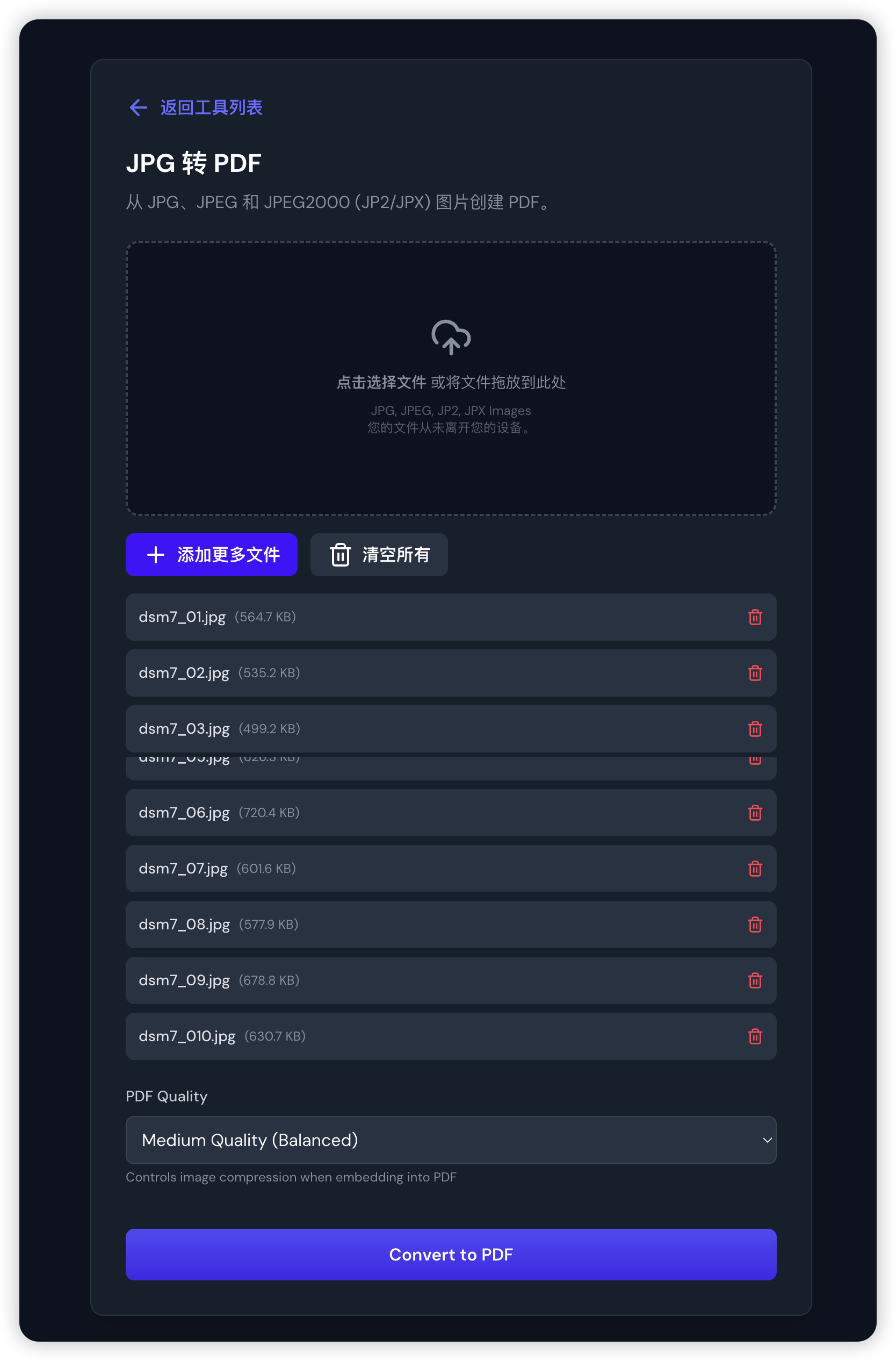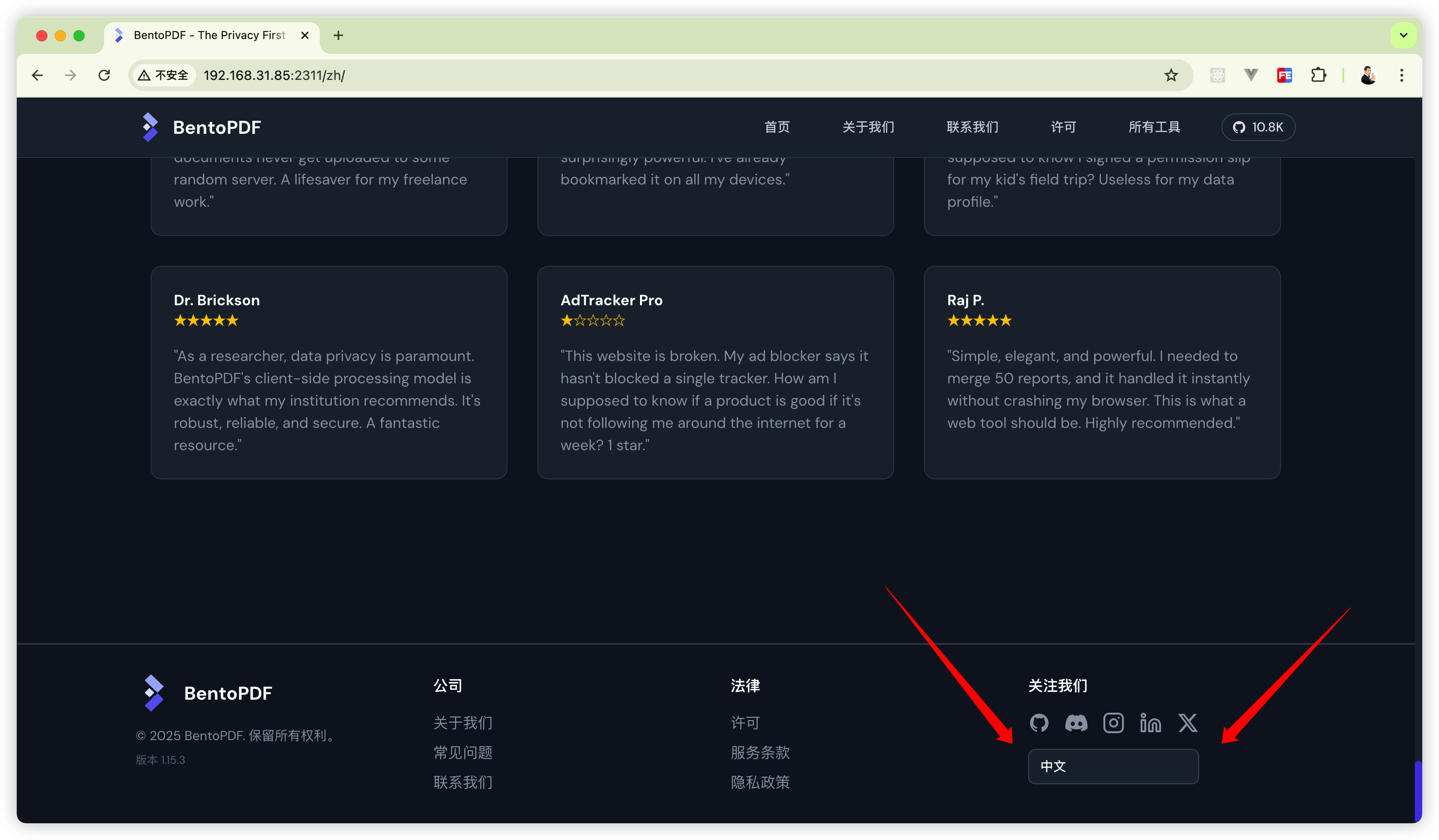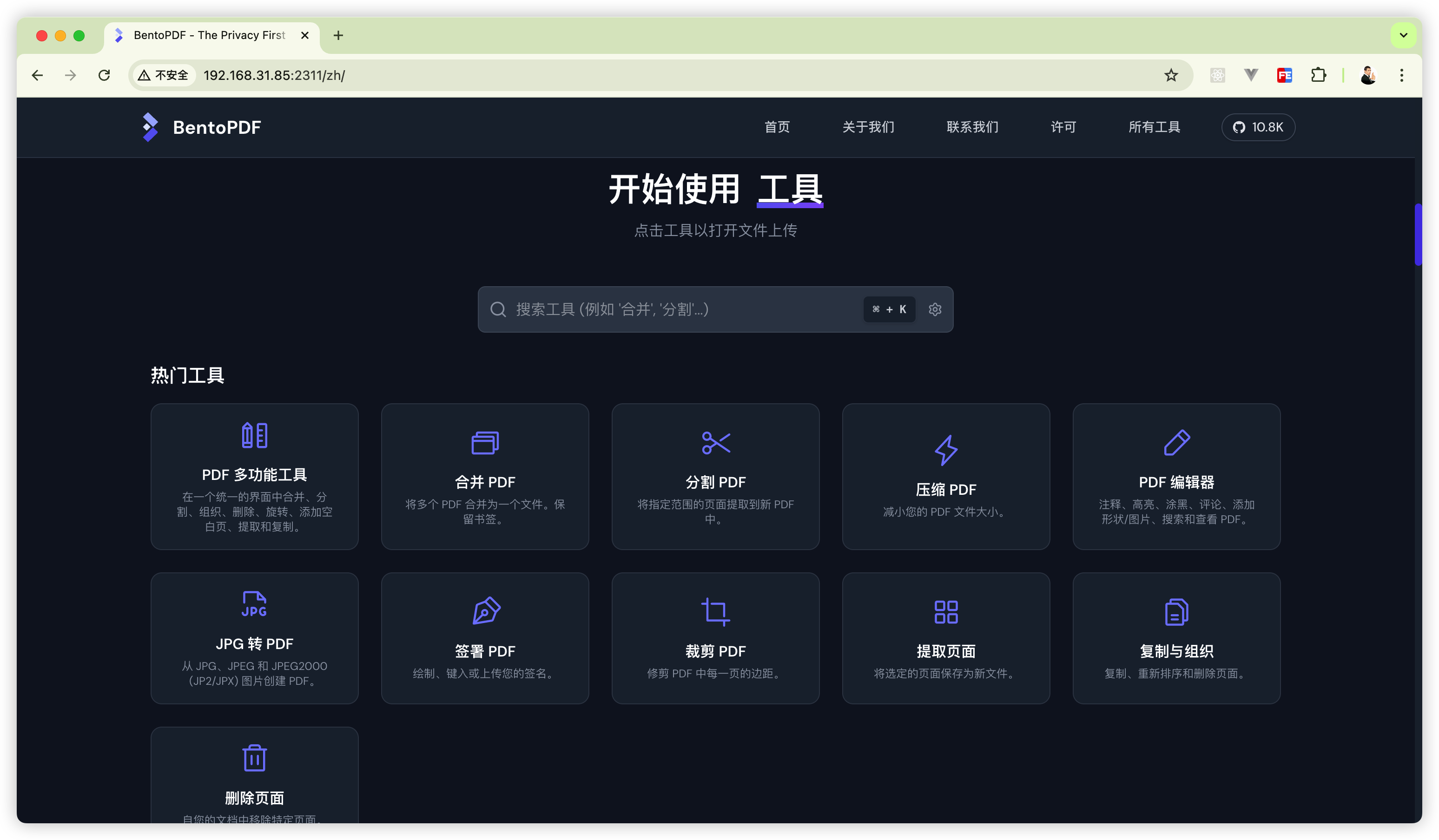 完成上面的操作后,打开浏览器,输入你 NAS的IP + BentoPDF端口,就能使用 BentoPDF 了。