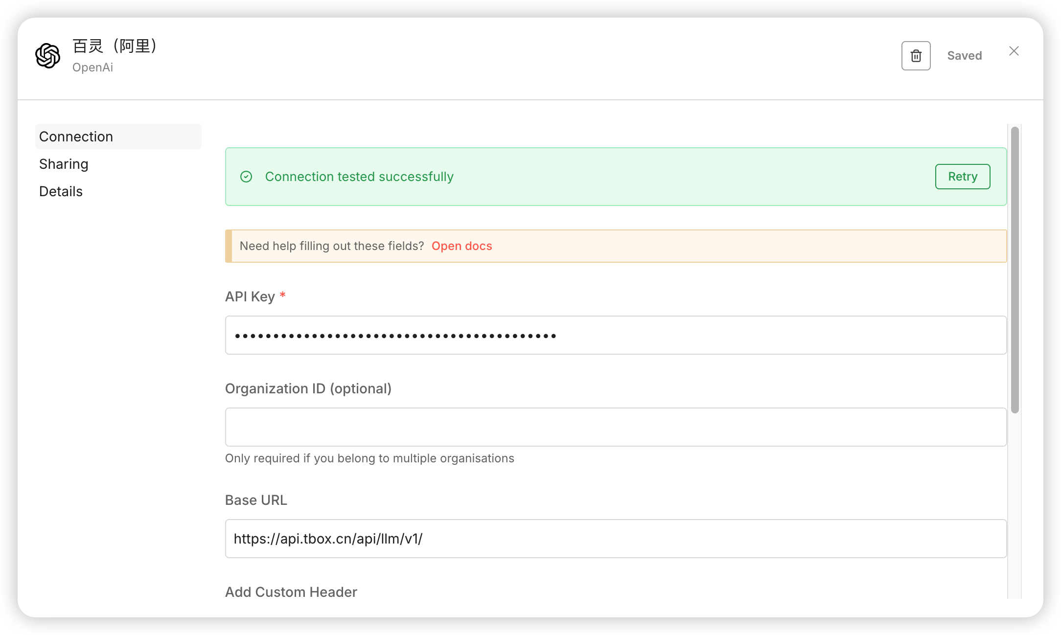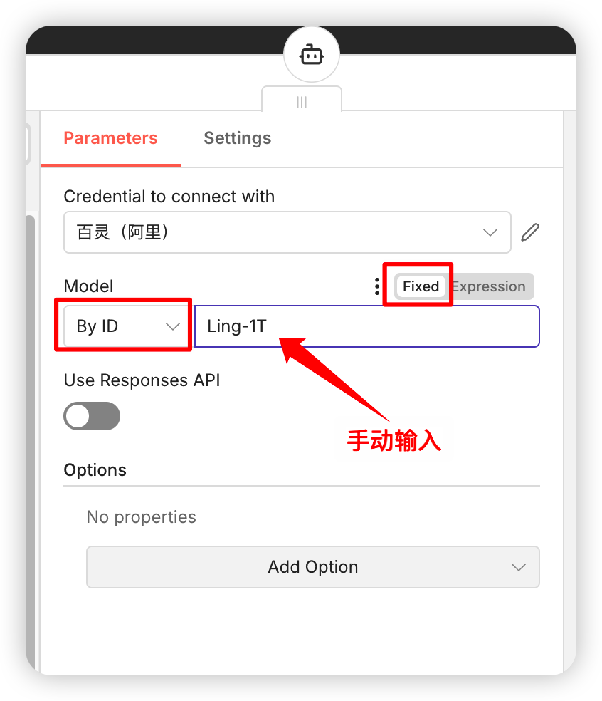 在 n8n 这边给百灵创建一个 OpenAI 的凭证。