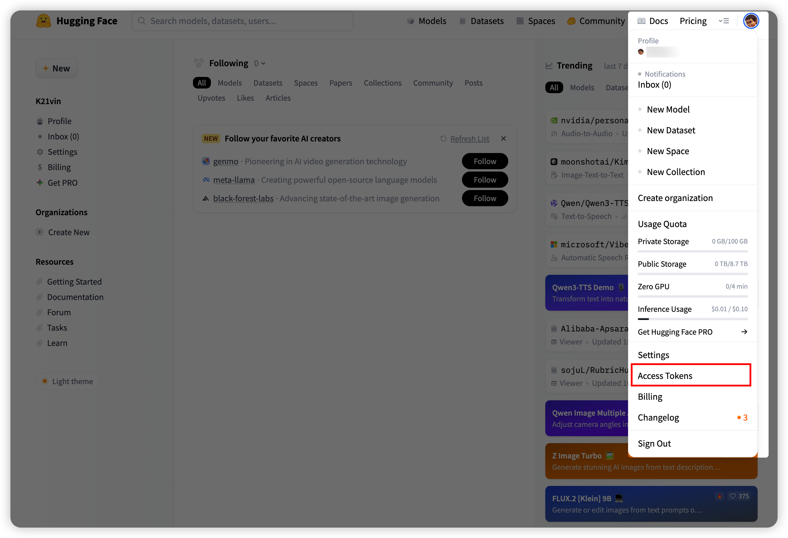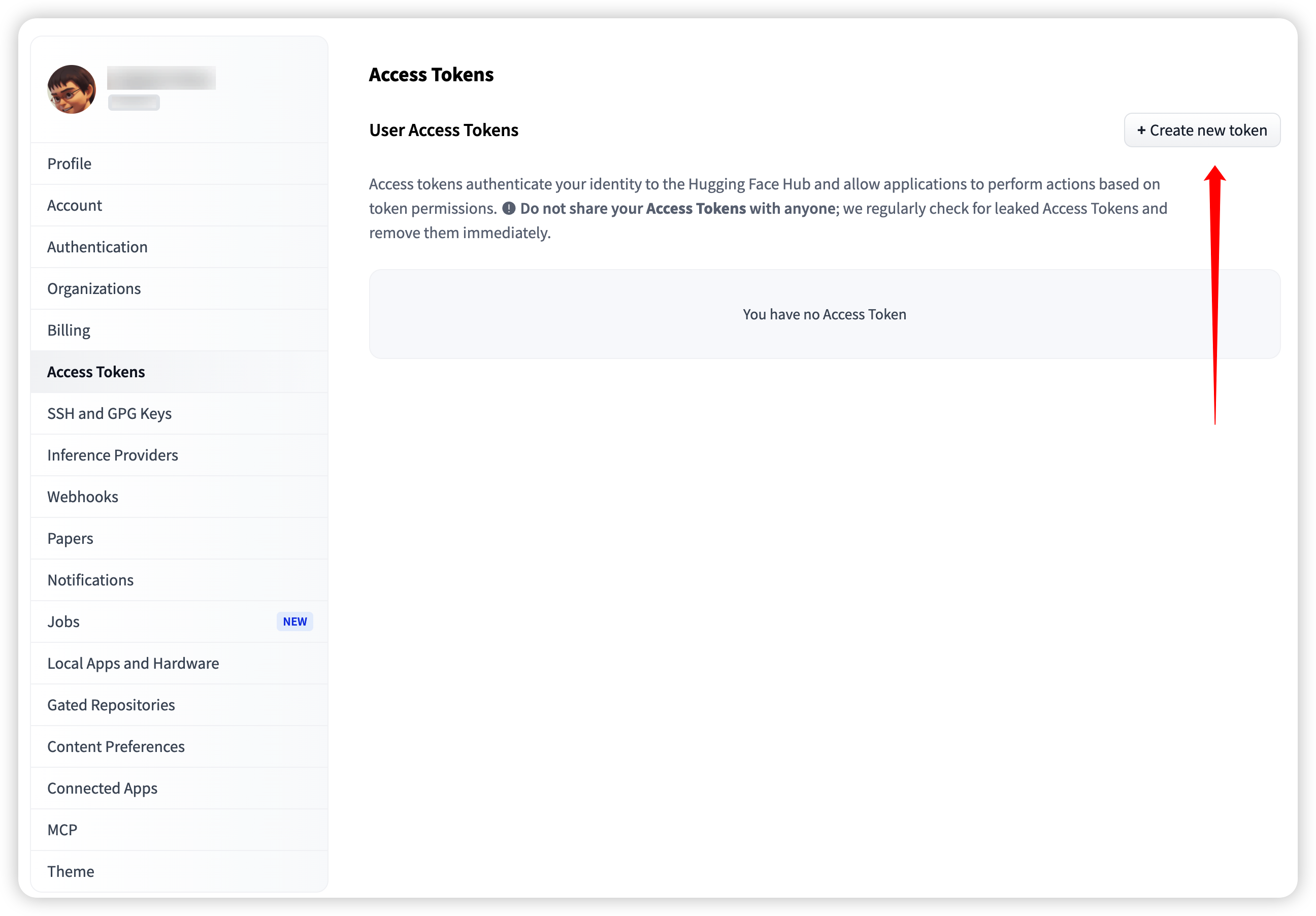 打开 Hugging Face 官网,登录后,点击右上角的头像,选择「Access Tokens」