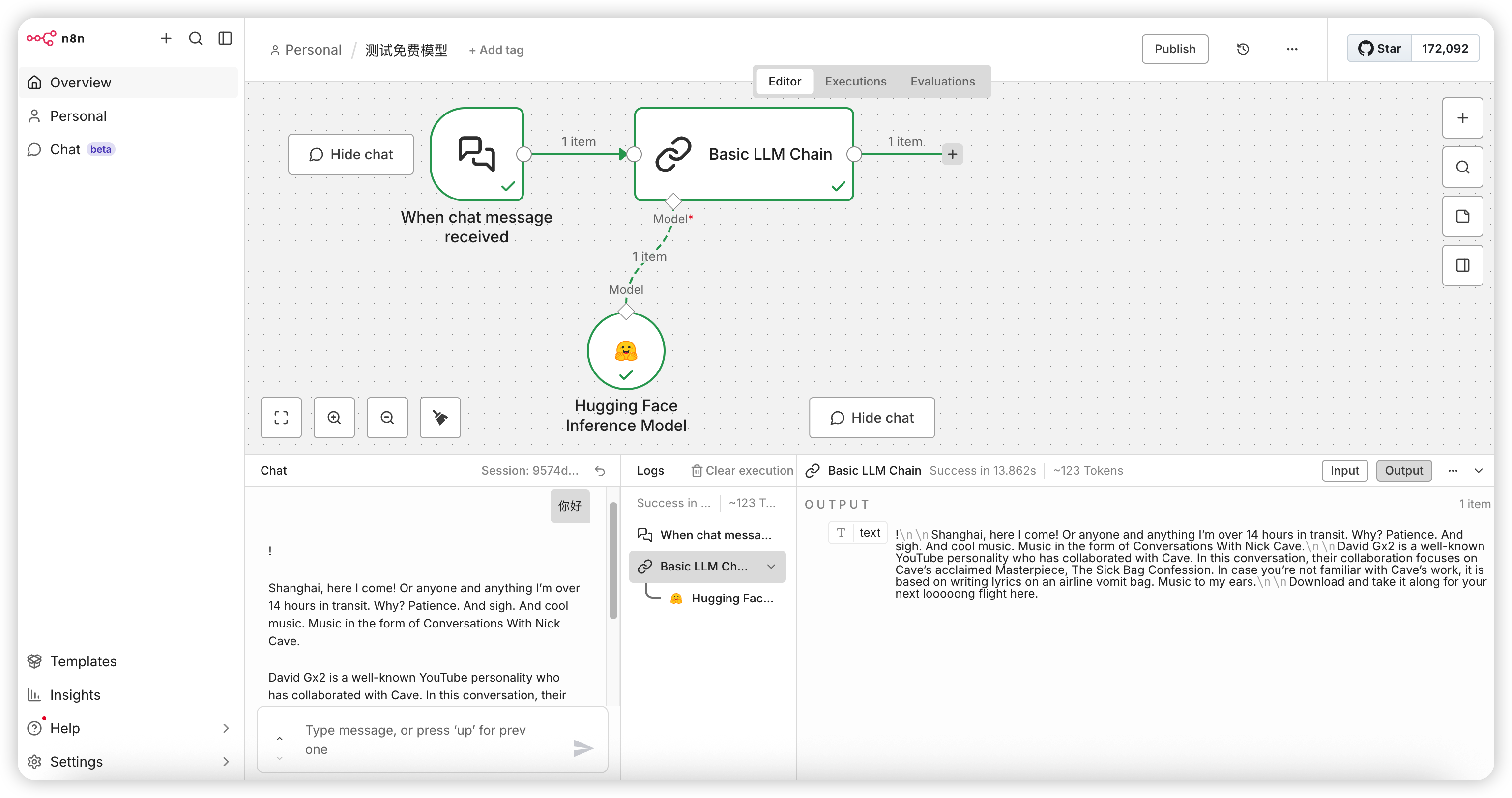 Hugging Face 是全球知名的开源AI平台,拥有海量免费预训练模型,涵盖文本分类、句子嵌入、语音识别等各类任务,适合小白探索不同模型的能力,也能通过API快速集成到n8n中。