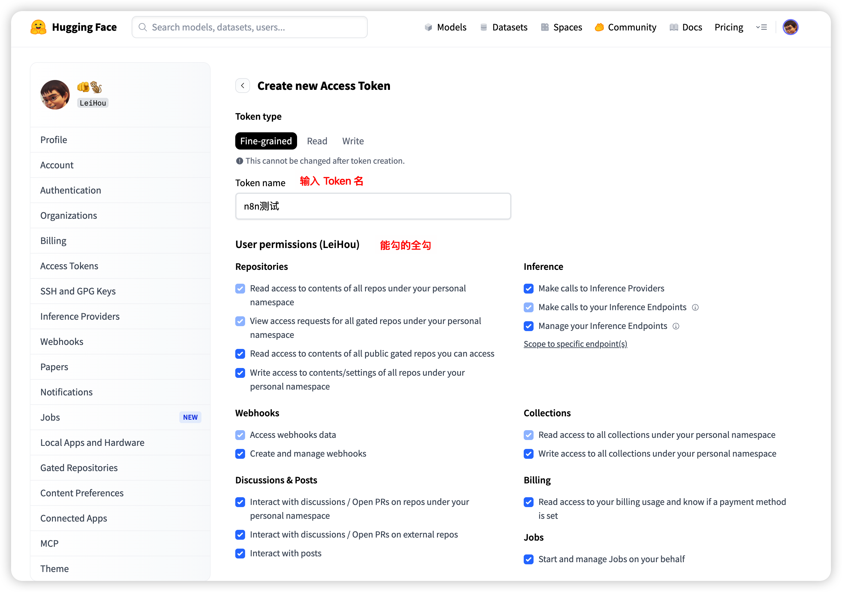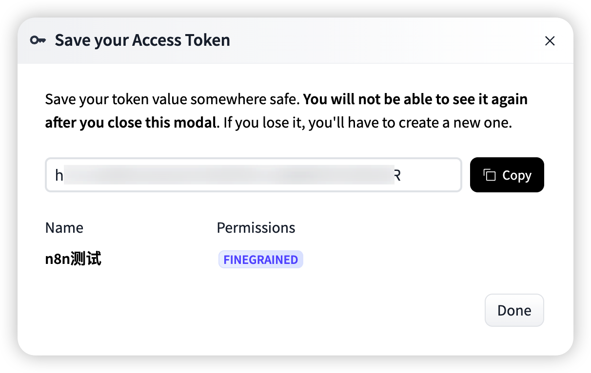 创建凭证的方法也很简单,将刚刚在 Hugging Face 申请的令牌复制到 API Key 这项里就行。