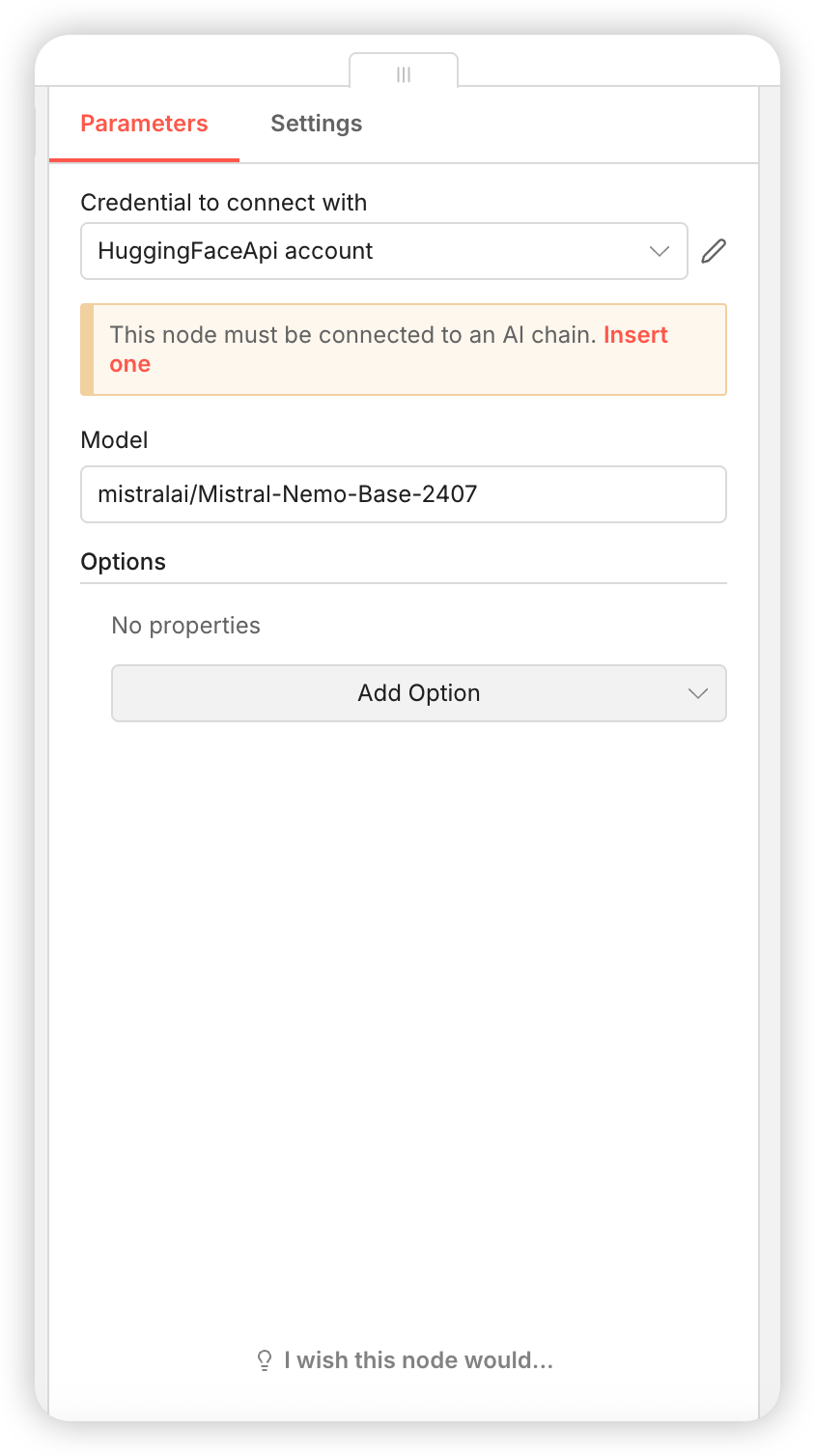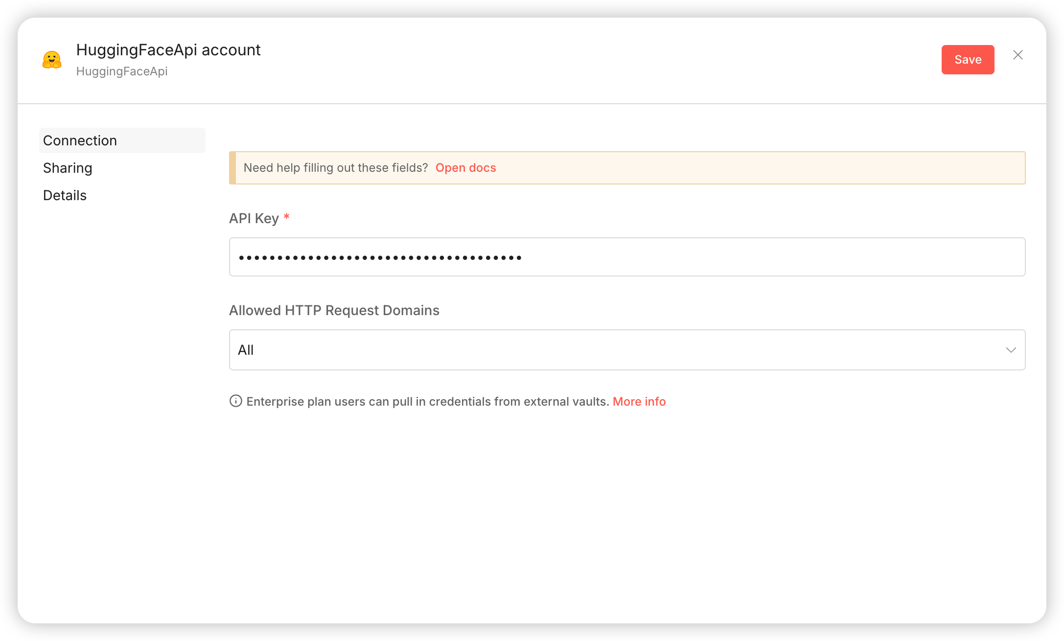 如果你第一次使用的话,在“Credential to connect with”项里选择“+ Create new credential”创建一个 Hugging Face 的凭证。如果已经有凭证了就是下图这样了。