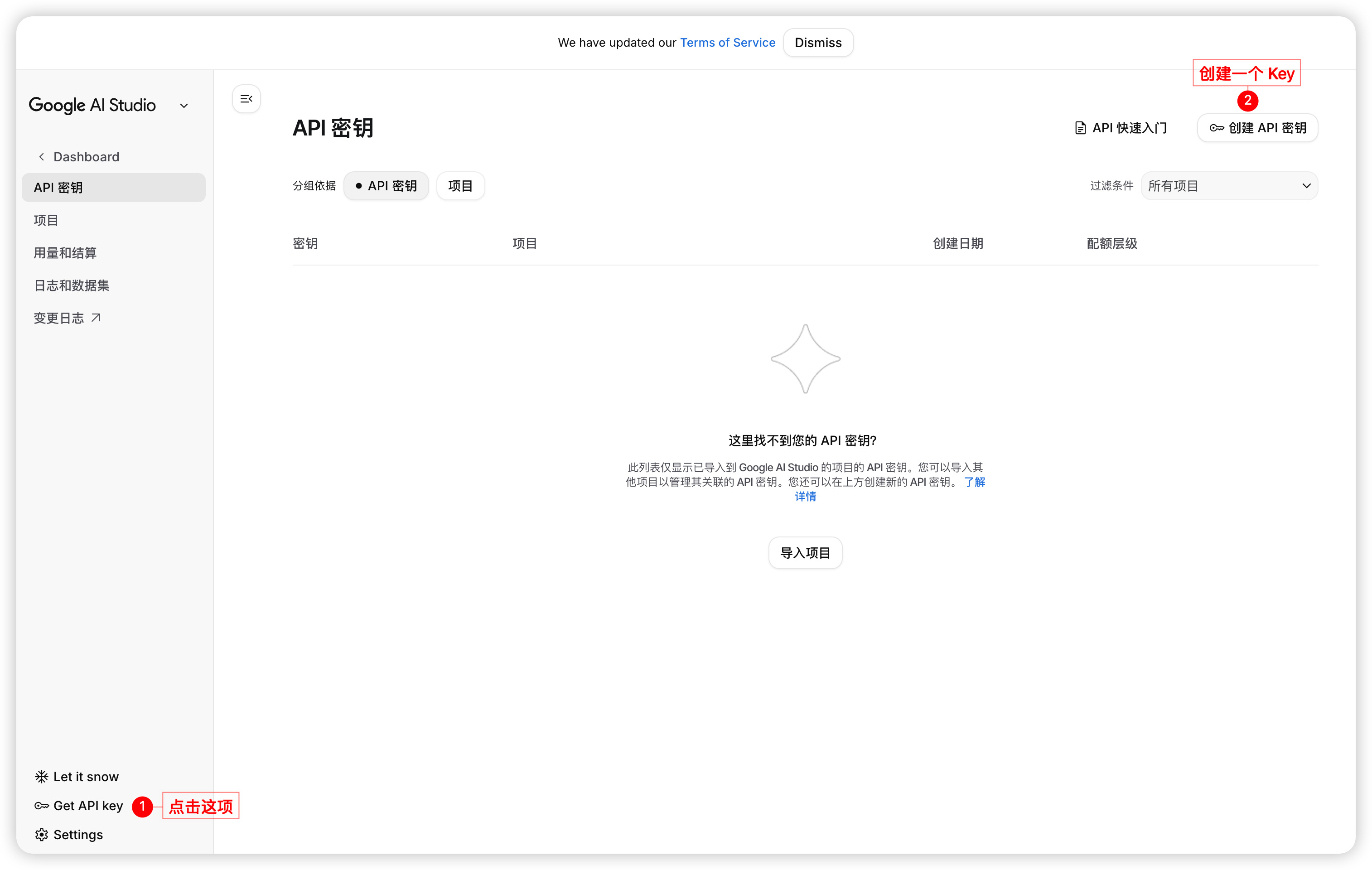 打开 Google AI Studio,登录完,点击左下角的“Get API key”。