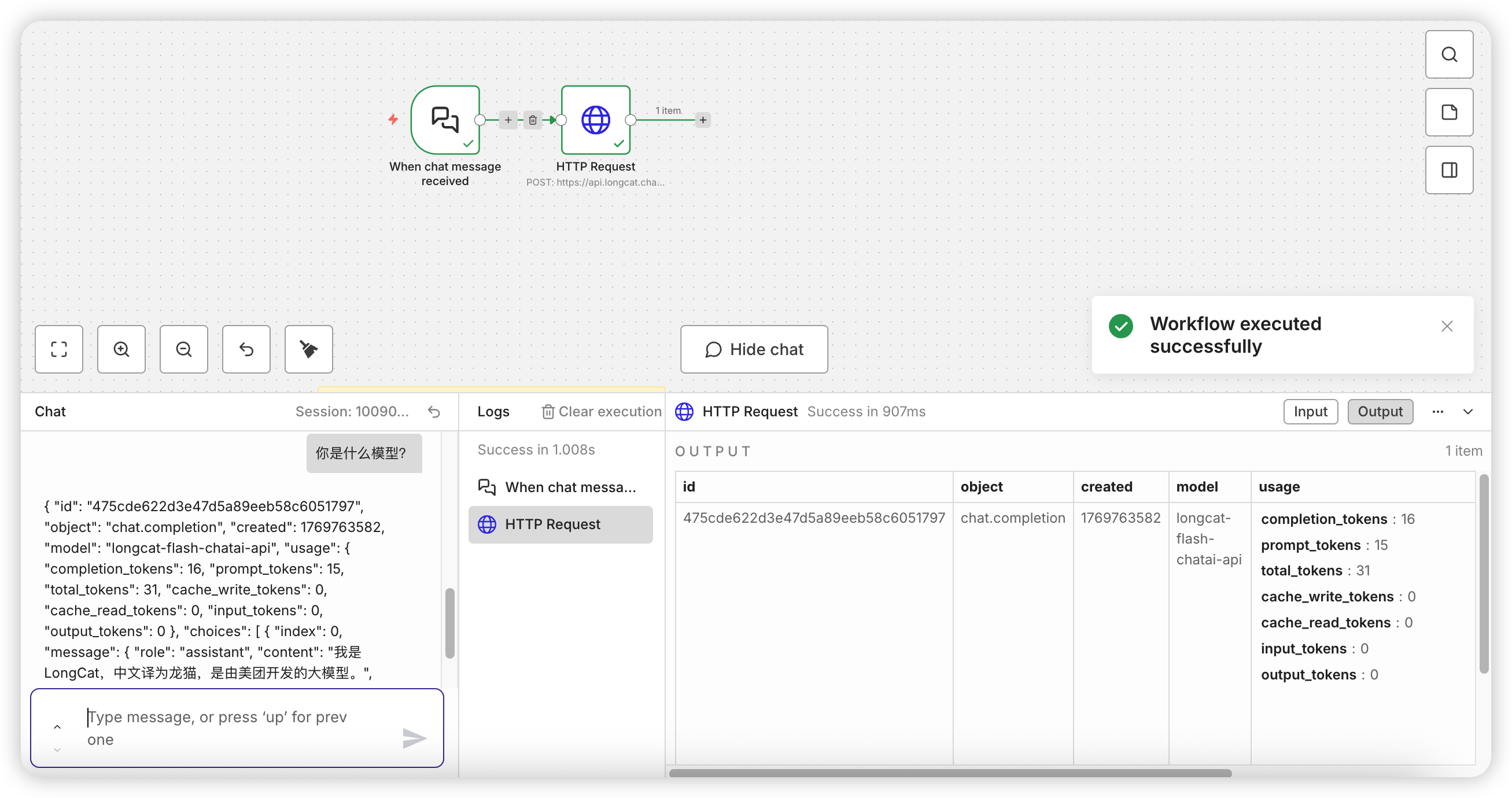 我用了 HTTP 节点接入,聊天对话的话 URL 可填入 https://api.longcat.chat/openai/v1/chat/completions。