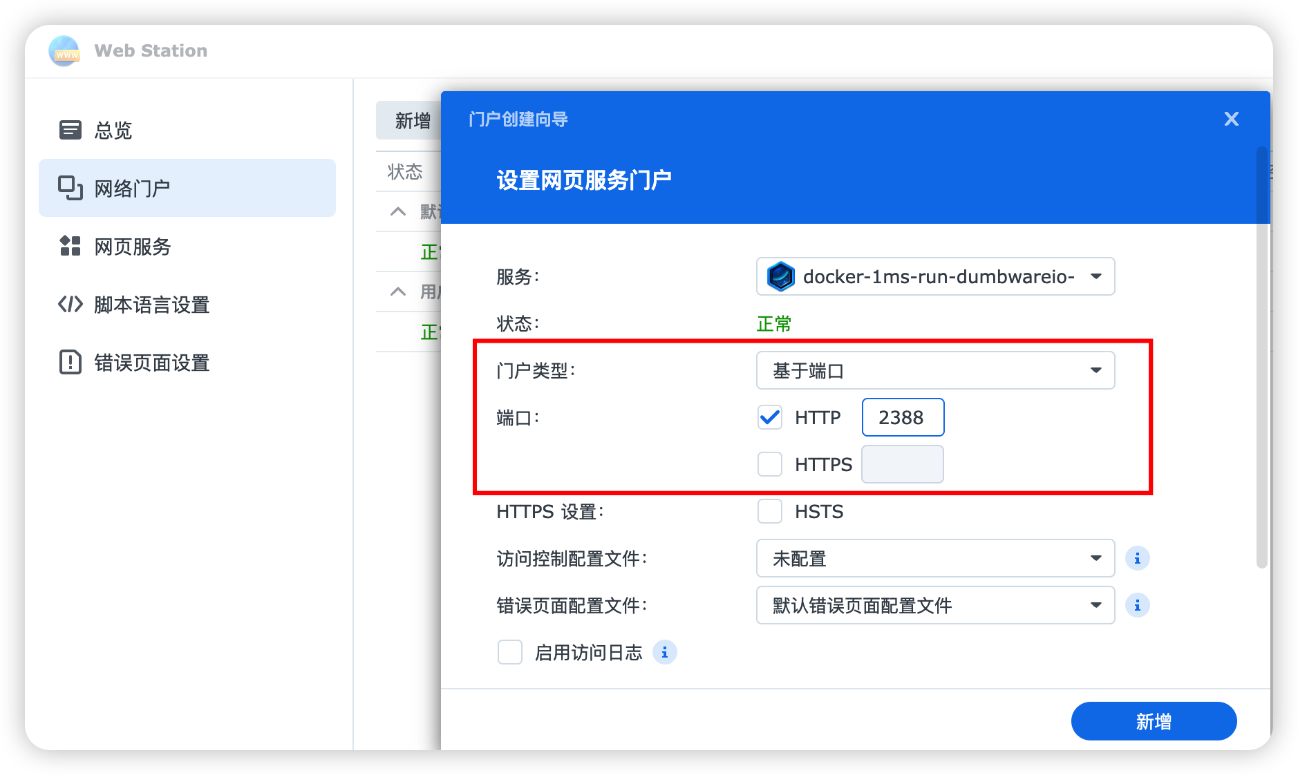 服务选择 dumbwareio-dumbassets,门户类型选择 基于端口,然后设置一个和其他项目不冲突的端口,比如我设置了 2388。