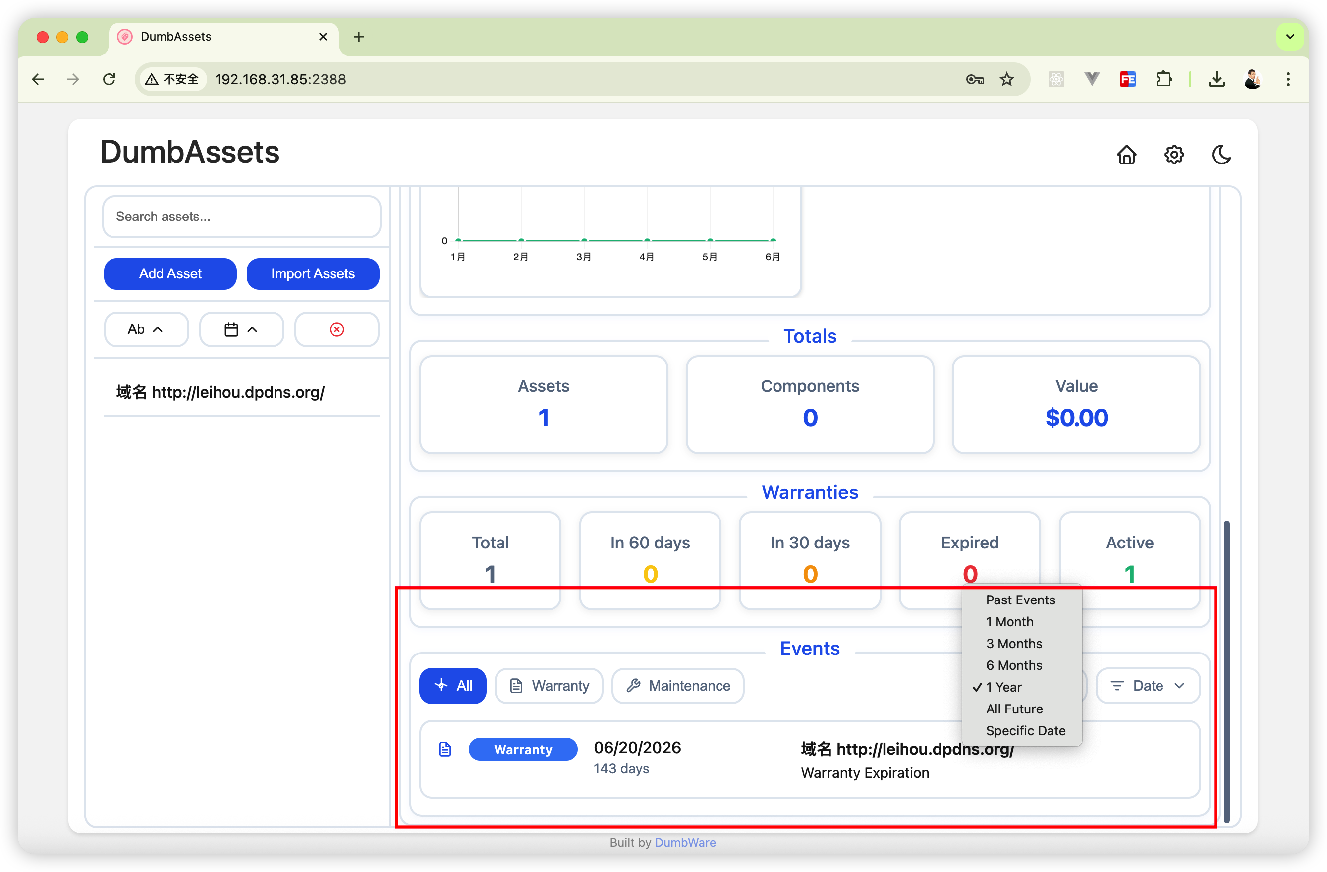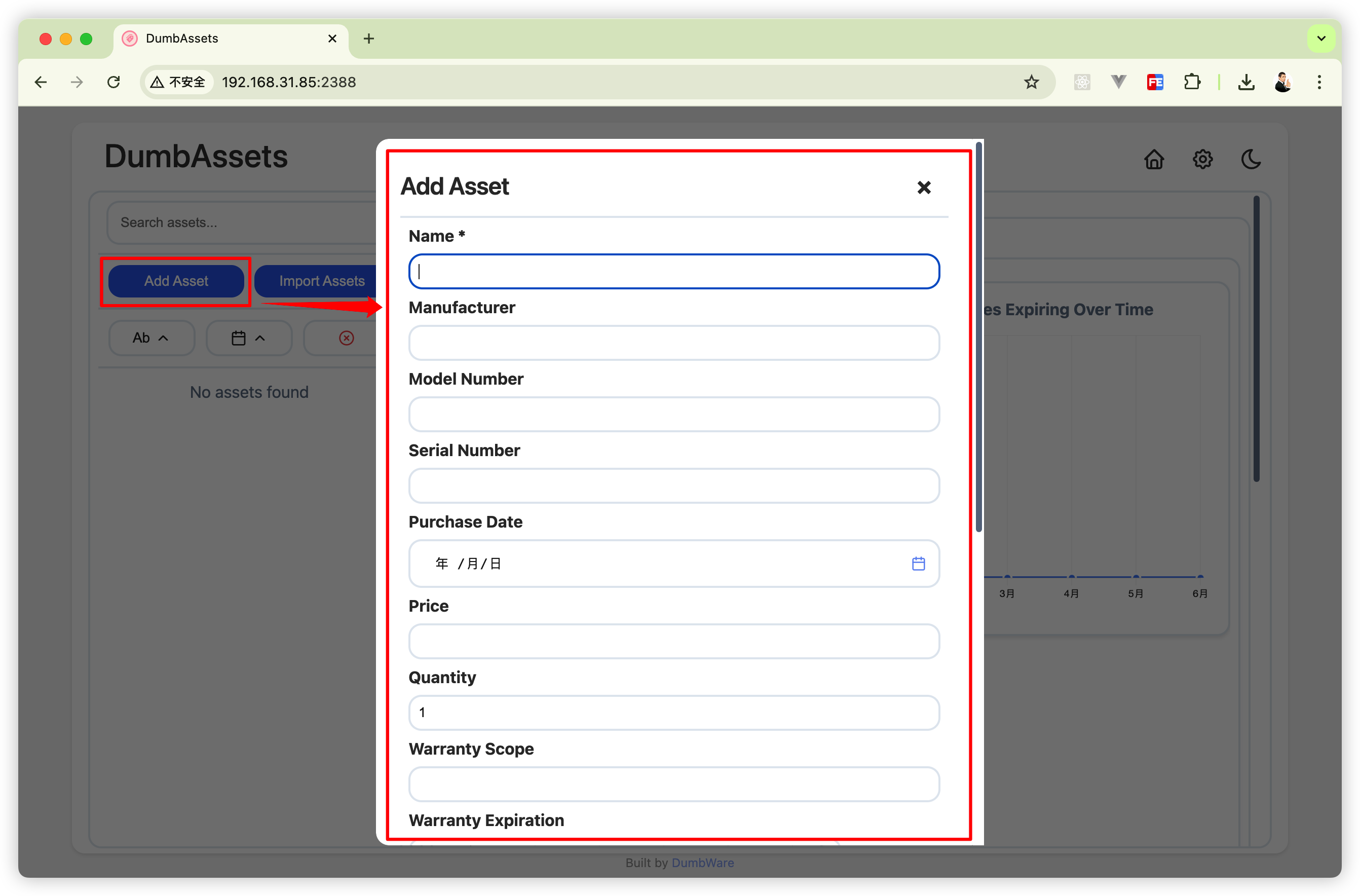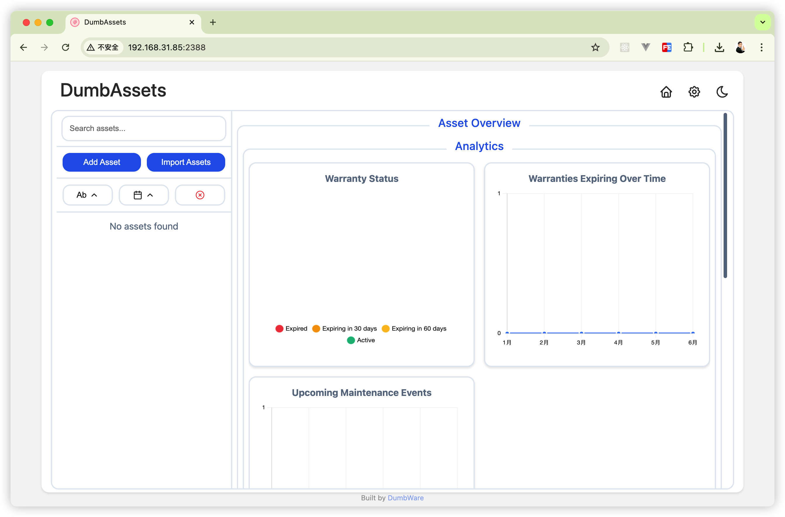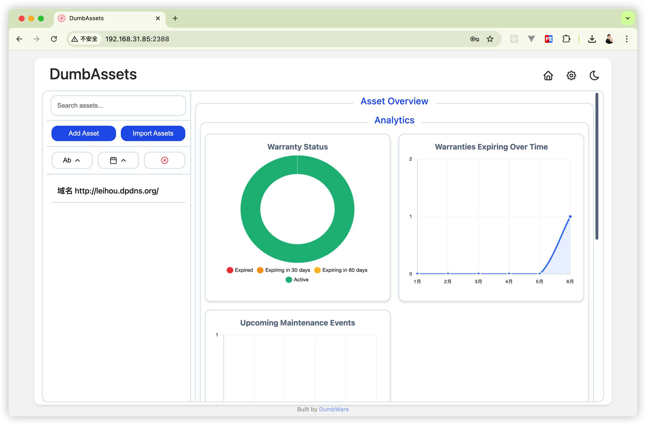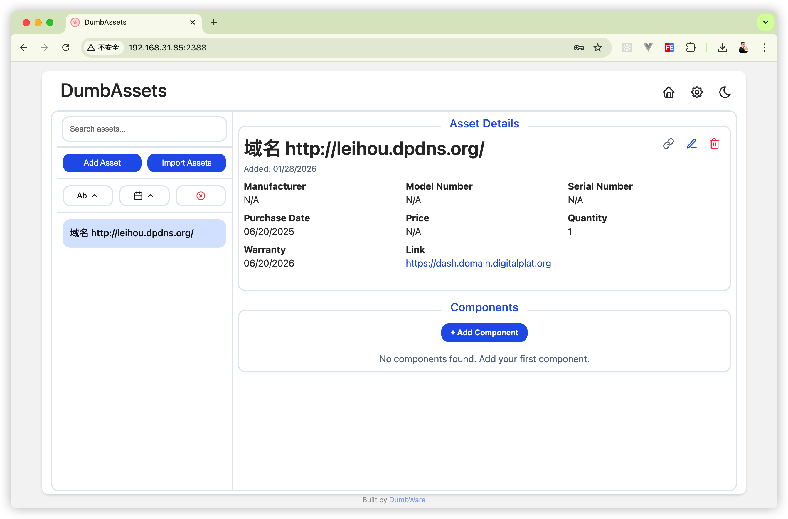 完成上面所有操作后,打开浏览器,输入NAS的IP地址,加上 dumbwareio-dumbassets的端口号(比如我的是 2388) 就可以使用 DumbAssets 了。