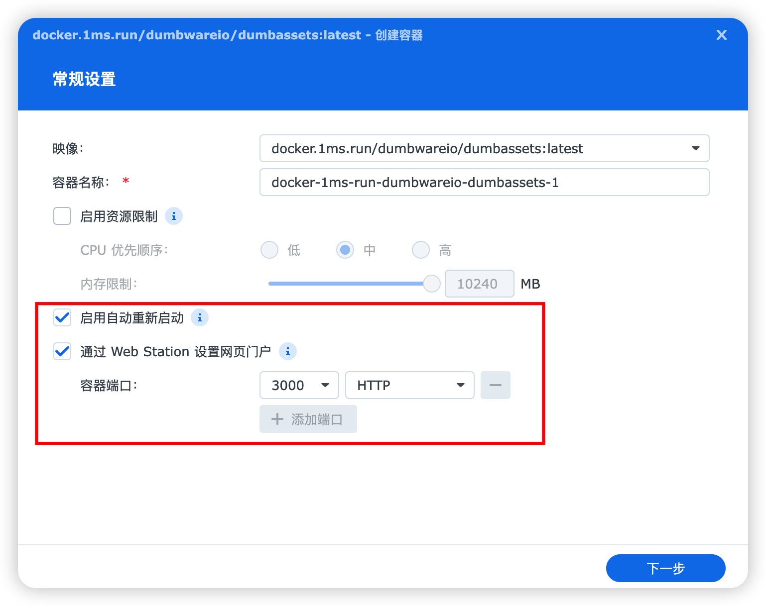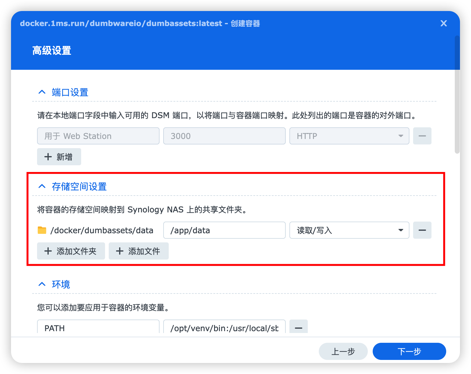 在「高级设置」这里,”存储空间设置“选择刚刚在“File Station”创建的”/docker/dumbassets/data“。