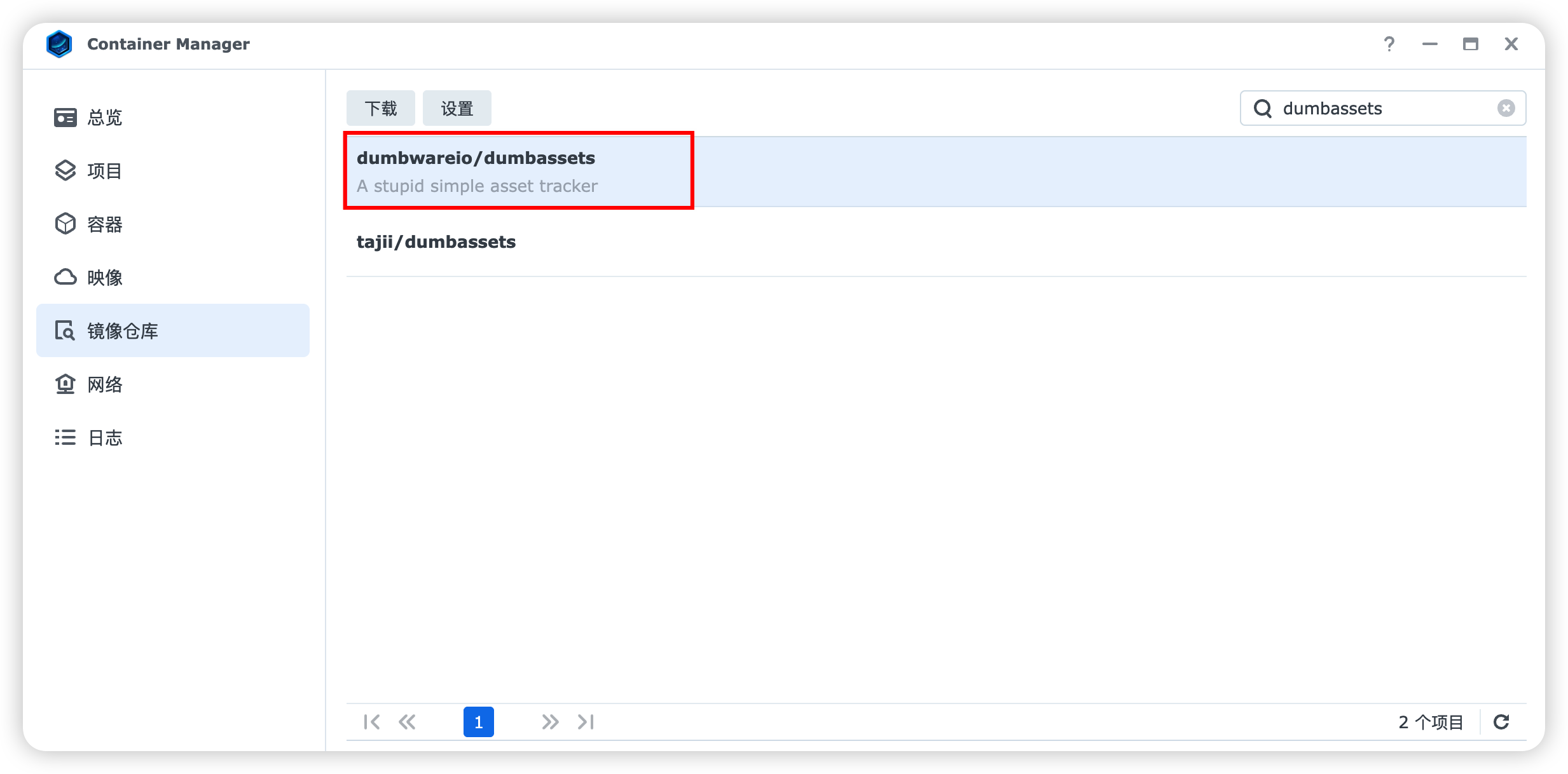 打开“Container Manager”,切换到「镜像仓库」页面,搜索 dumbassets,下载下图红框选中的 dumbwareio/dumbassets。