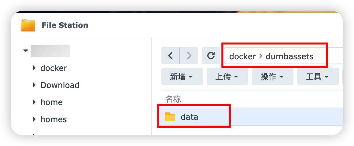 打开“File Station”,在“docker”文件夹下创建一个“dumbassets”文件夹,然后再“dumbassets”里创建一个“data”文件夹。