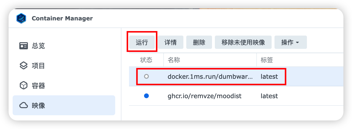 下载成功后,切换到「映像」页面,选中刚刚下载的 dumbwareio/dumbassets,点击“运行”。