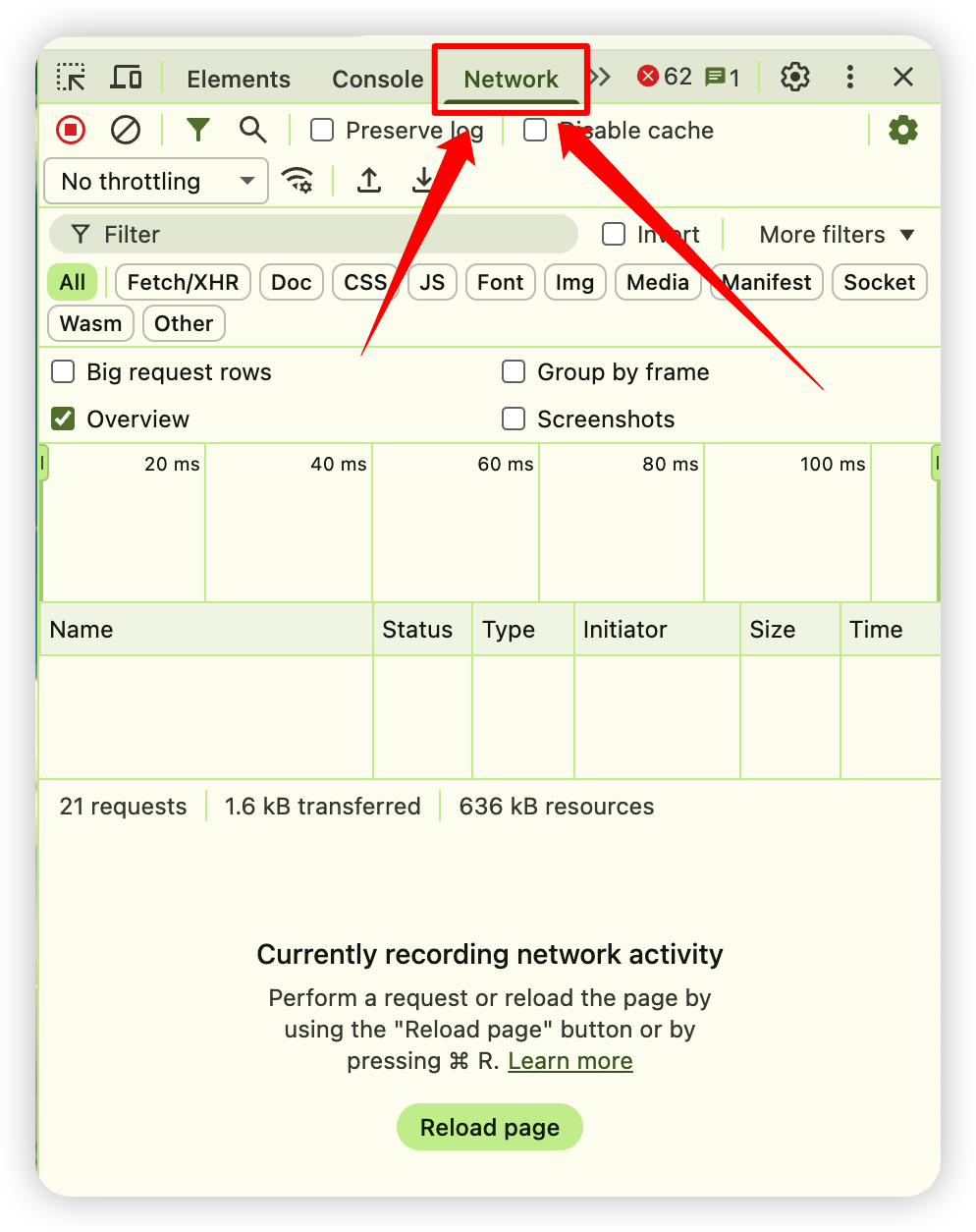 然后按 F12 打开浏览器的控制台,切换到 Network 面板。