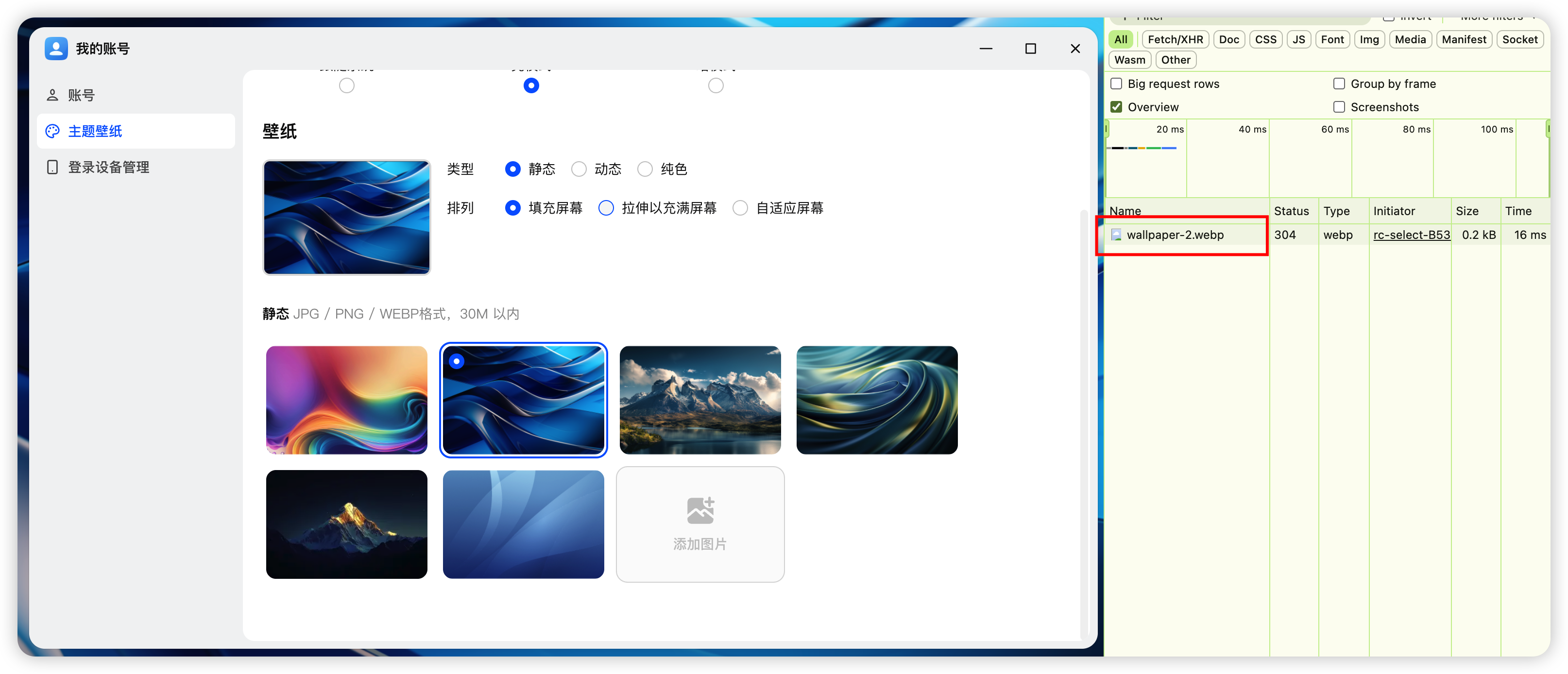 我刚刚点的是 2 号壁纸,所以地址是 http://192.168.31.33:5666/static/bg/wallpaper-2.webp。