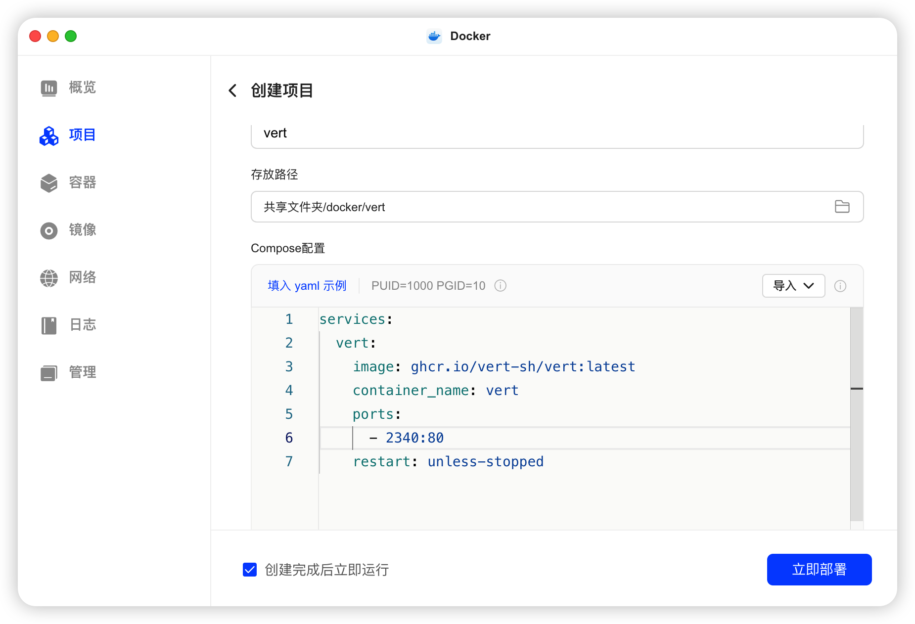 这次我使用绿联的 NAS 部署 VERT.sh,其他品牌的 NAS 只要支持 Docker 的,部署步骤都是大同小异。