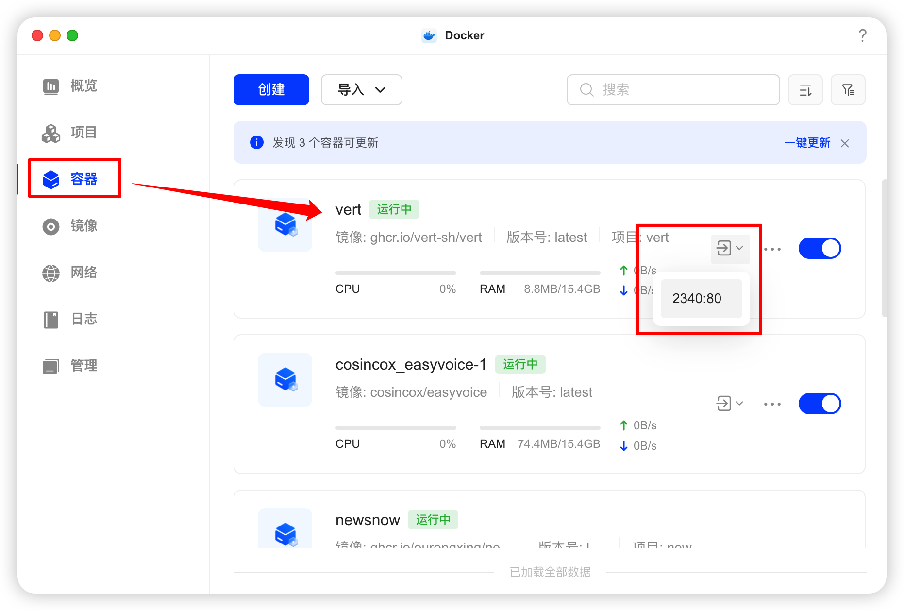 项目构建完成后,点击左侧菜单”容器“这项,找到 vert 这项,点击它右侧的小箭头会弹出端口号,点击端口这个按钮。