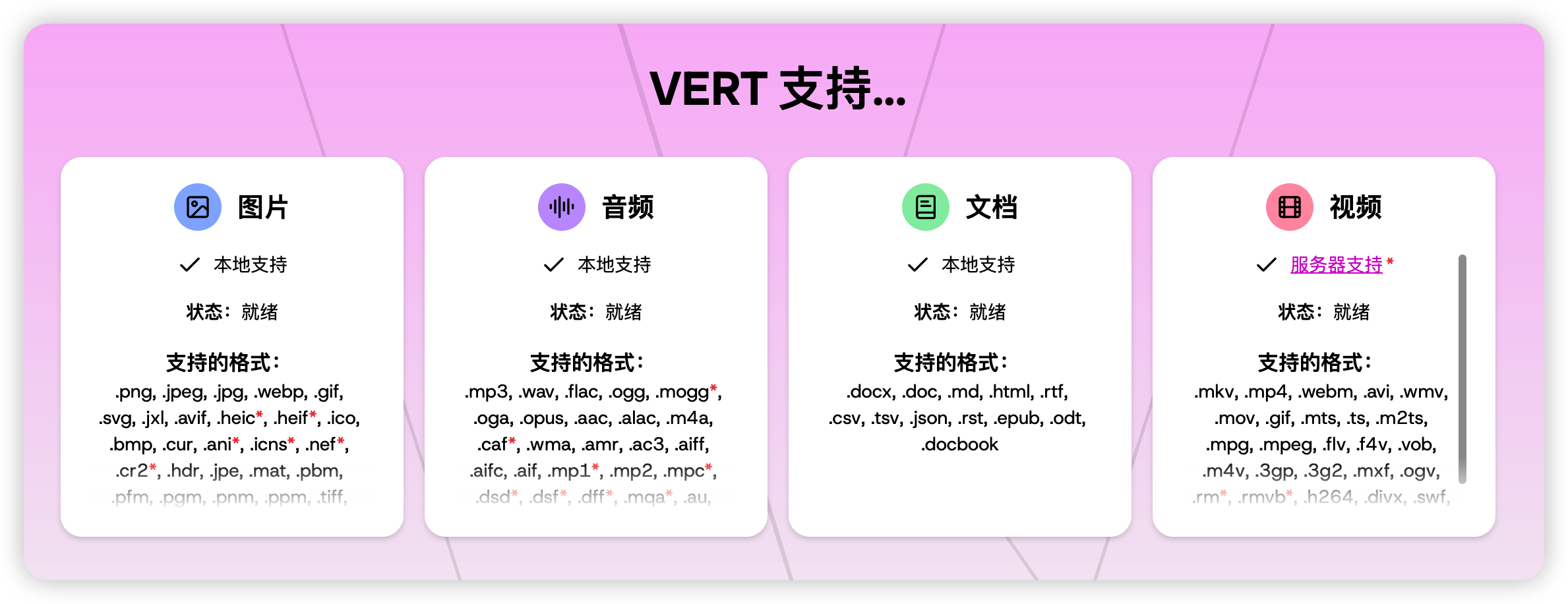 回到首页可以看到 VERT.sh 支持图片、音频、文档和视频等文件的格式转换。