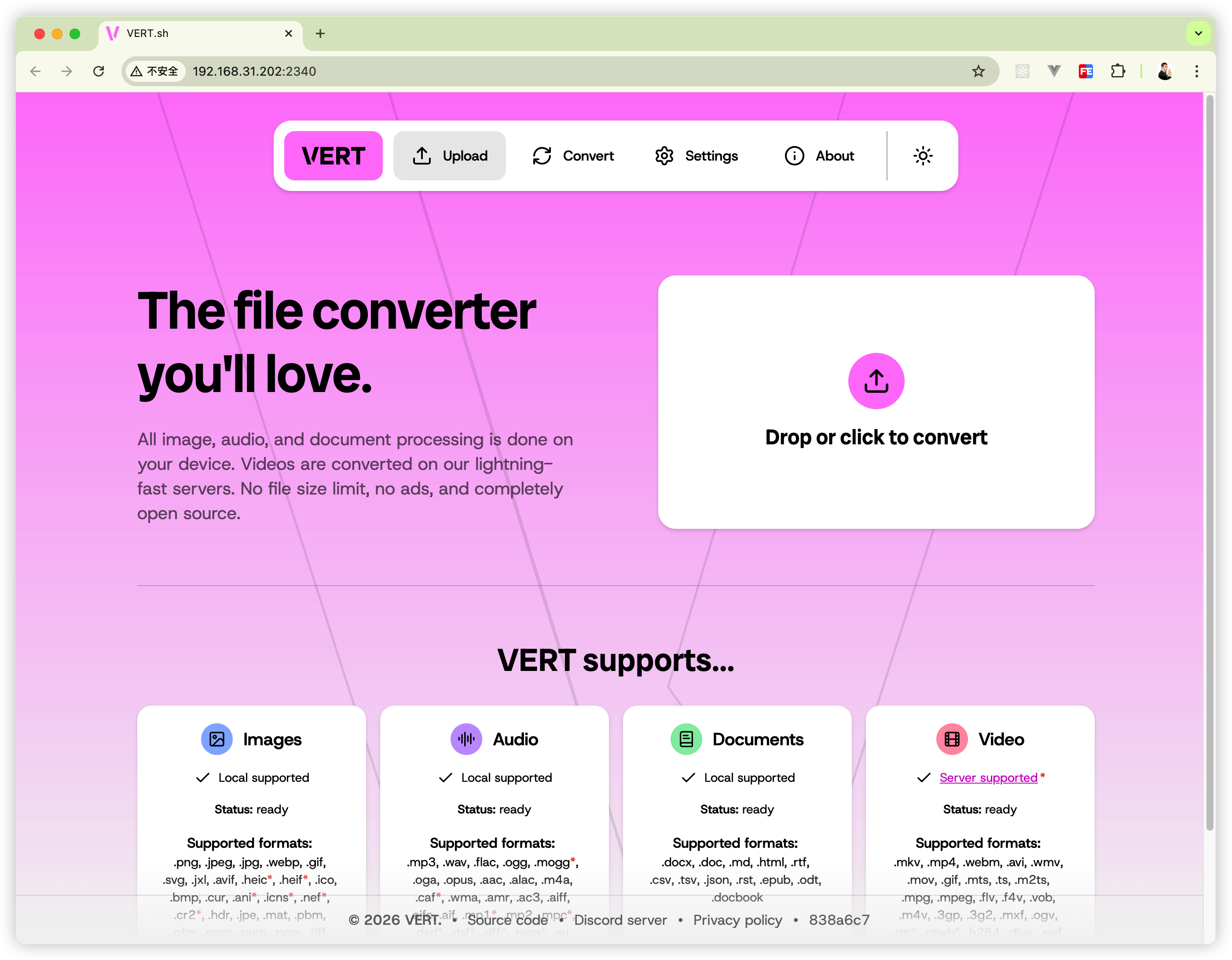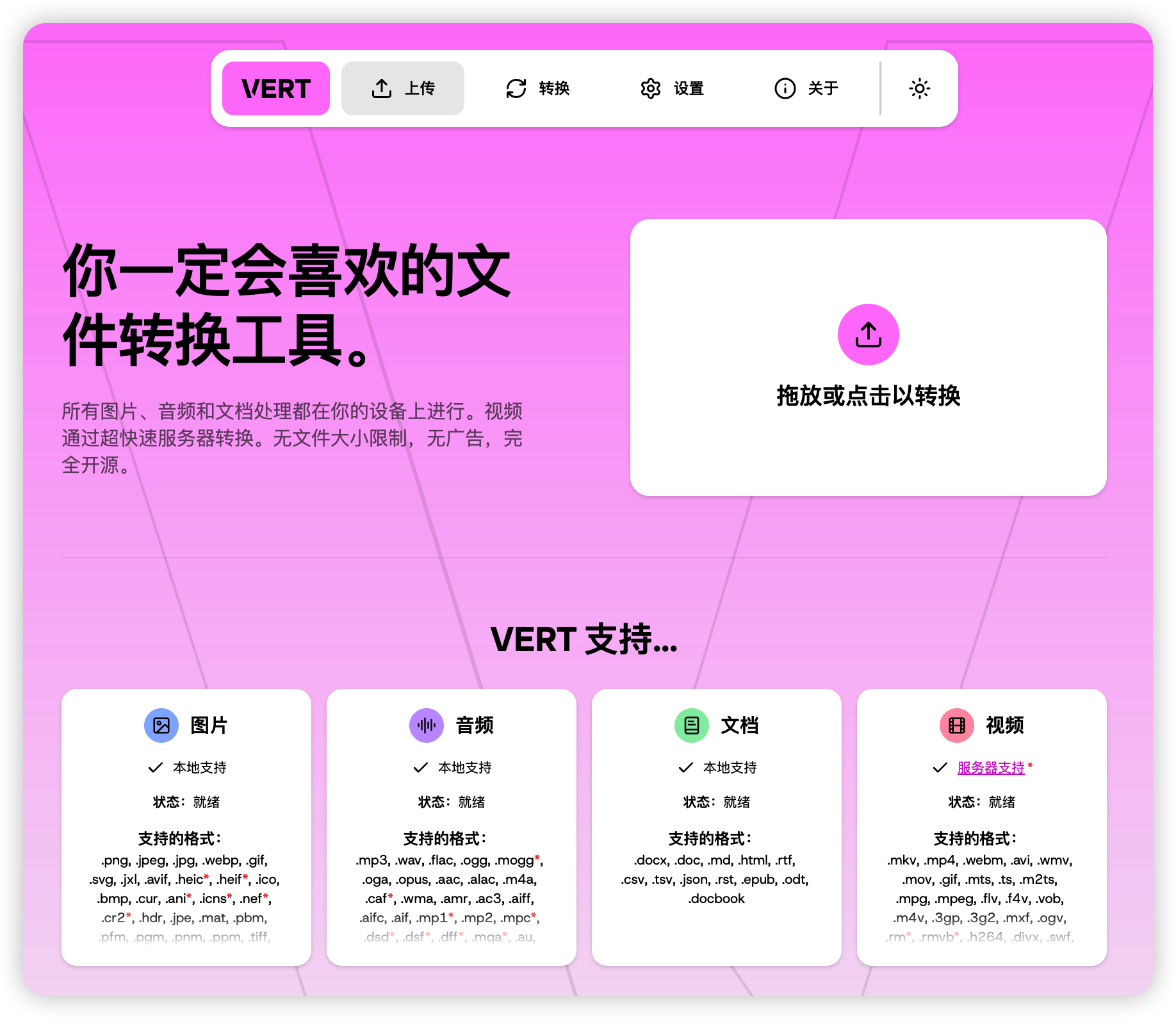 VERT.sh 是一款开源文件转换工具,它所有转换都在本地浏览器完成,文件(除视频外)永不上传云端,支持 n 种格式(文档、图片、音频、视频),无广告、无文件大小限制,开箱即用!
