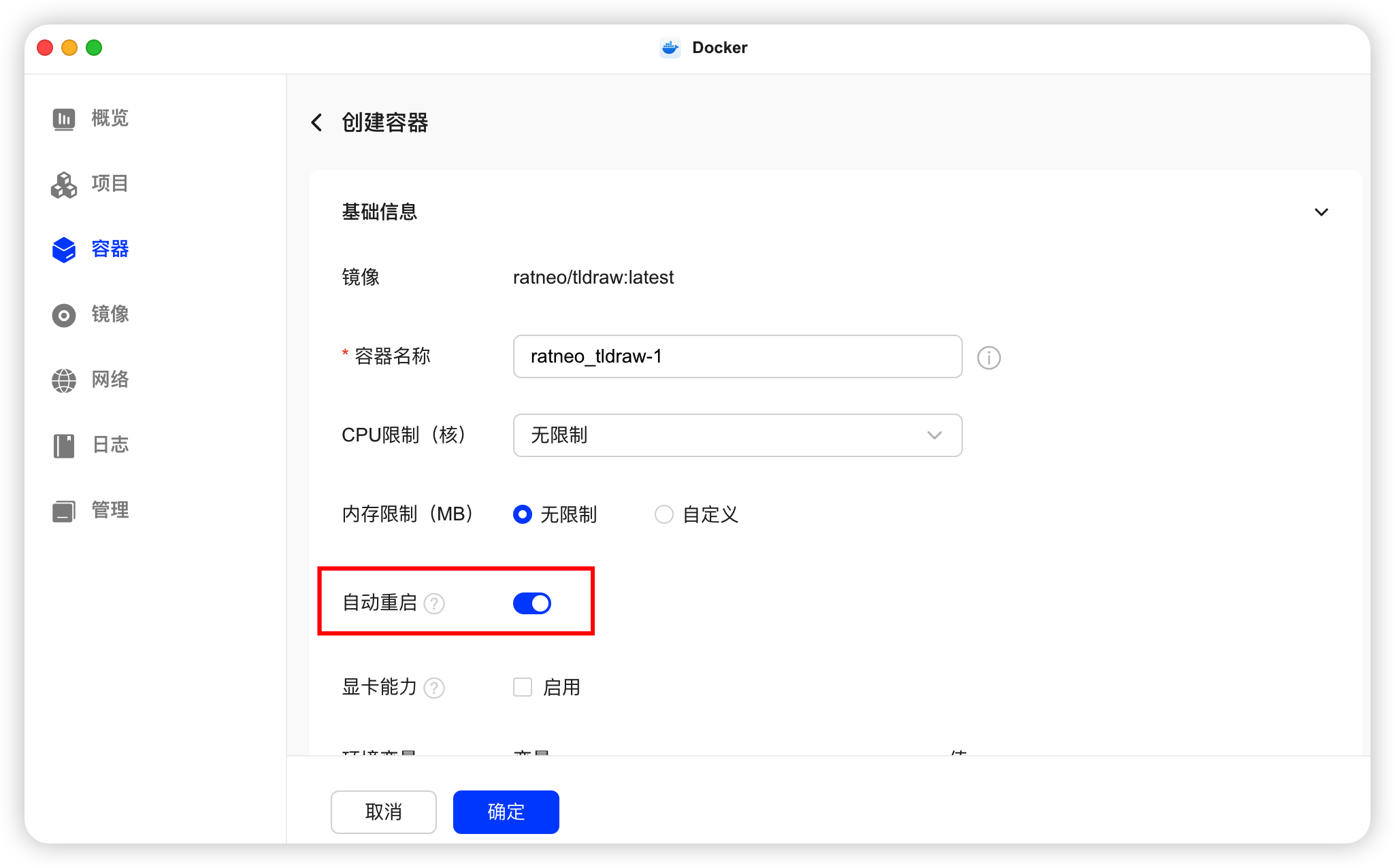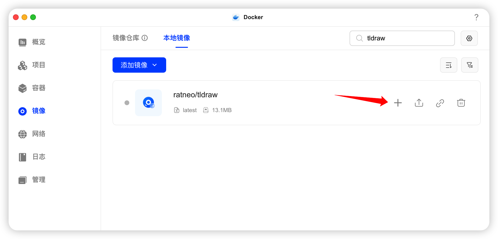 下载完成后,切换到“本地镜像”页面,点击 ratneo/tldraw 旁边的加号,创建容器。