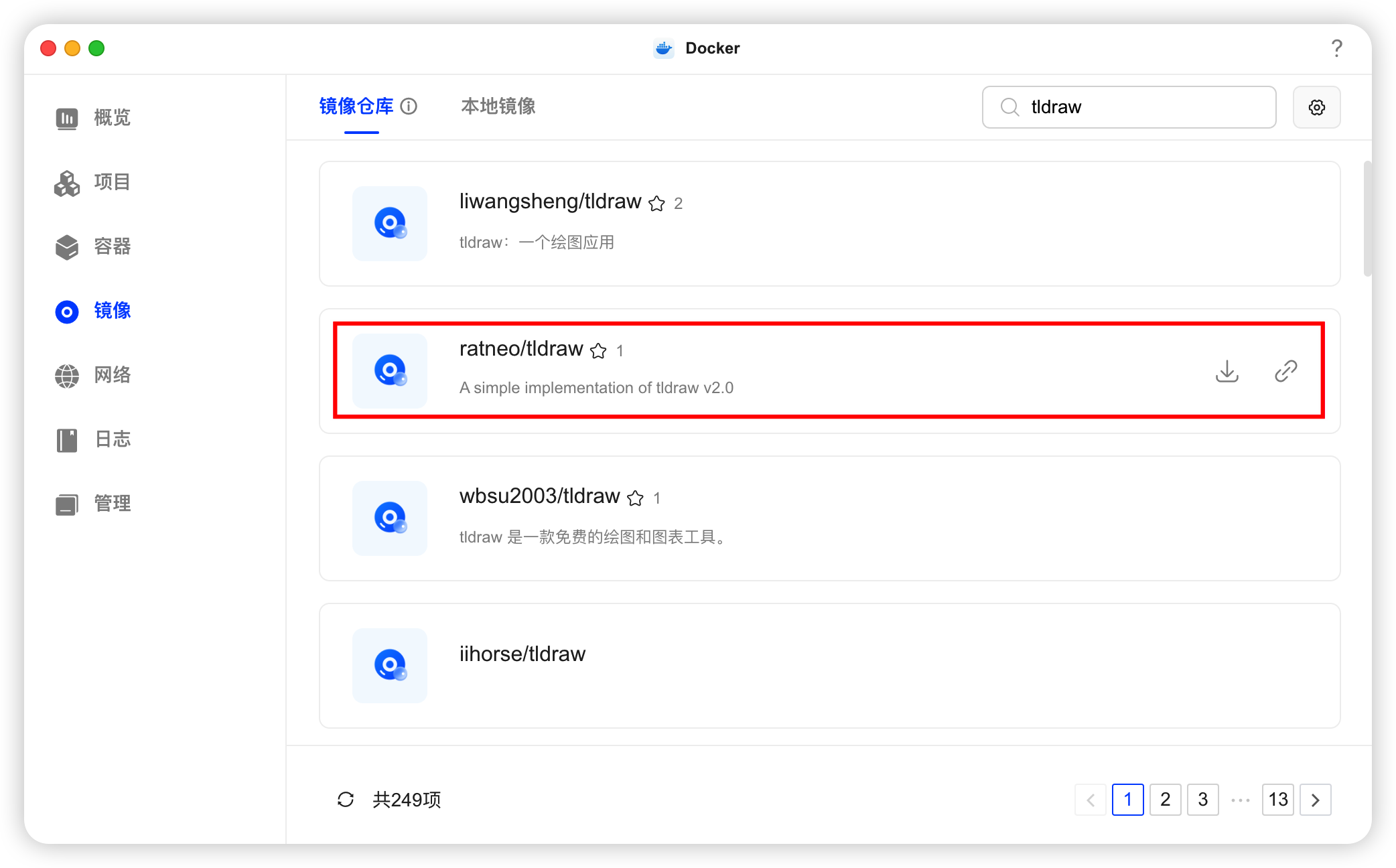 打开“Docker”应用,在“镜像”页面搜索“tldraw”,下载红框选中的那个 ratneo/tldraw。