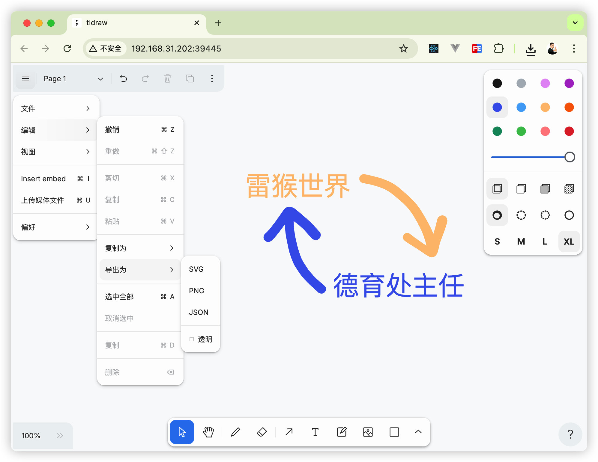 它支持将画布内容导出为 SVG、PNG 和 JSON 这几种格式。