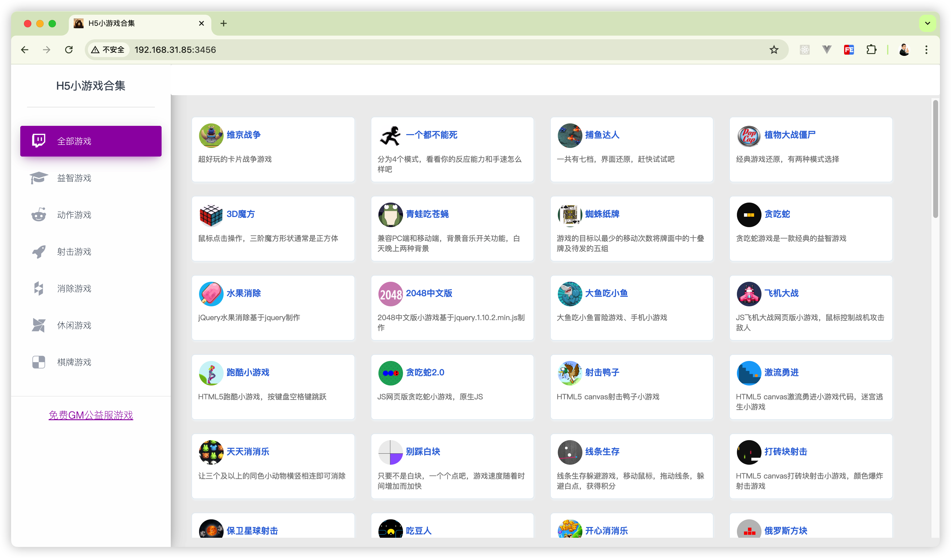 80h5 是一款集合了80款经典小游戏的平台,聚合了植物大战僵尸、捕鱼达人、消消乐等海量经典休闲 H5 小游戏。但虽然它叫 H5,我实测过部分游戏在移动端有点兼容问题,PC 端没问题。