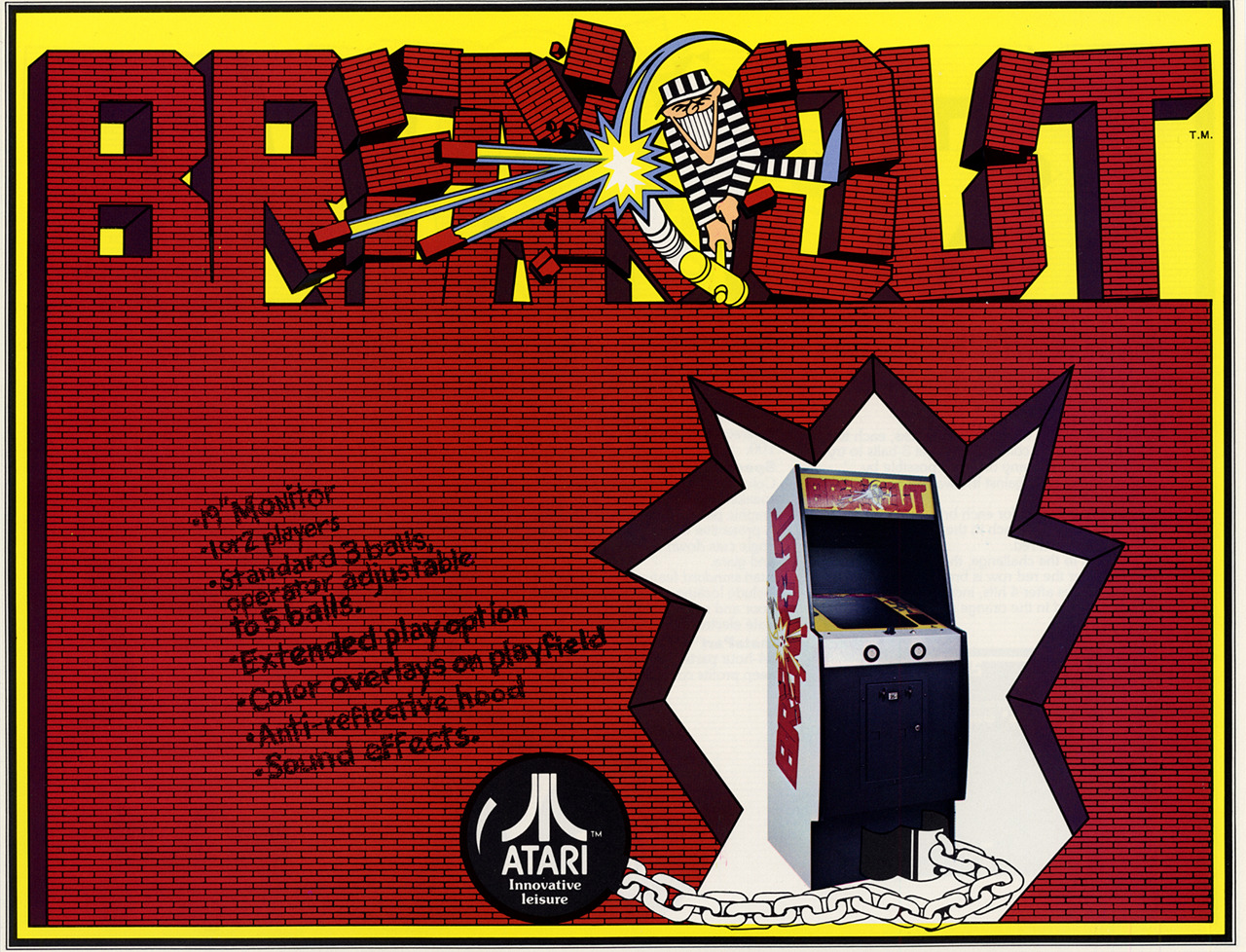 《打砖块》发布于1976年,由当时在雅达利工作的史蒂夫·乔布斯,以及他的朋友斯蒂夫·沃兹尼亚克两人设计开发。没错,就是后来创建苹果公司的那个乔布斯,后来由雅达利改造移植到街机里。