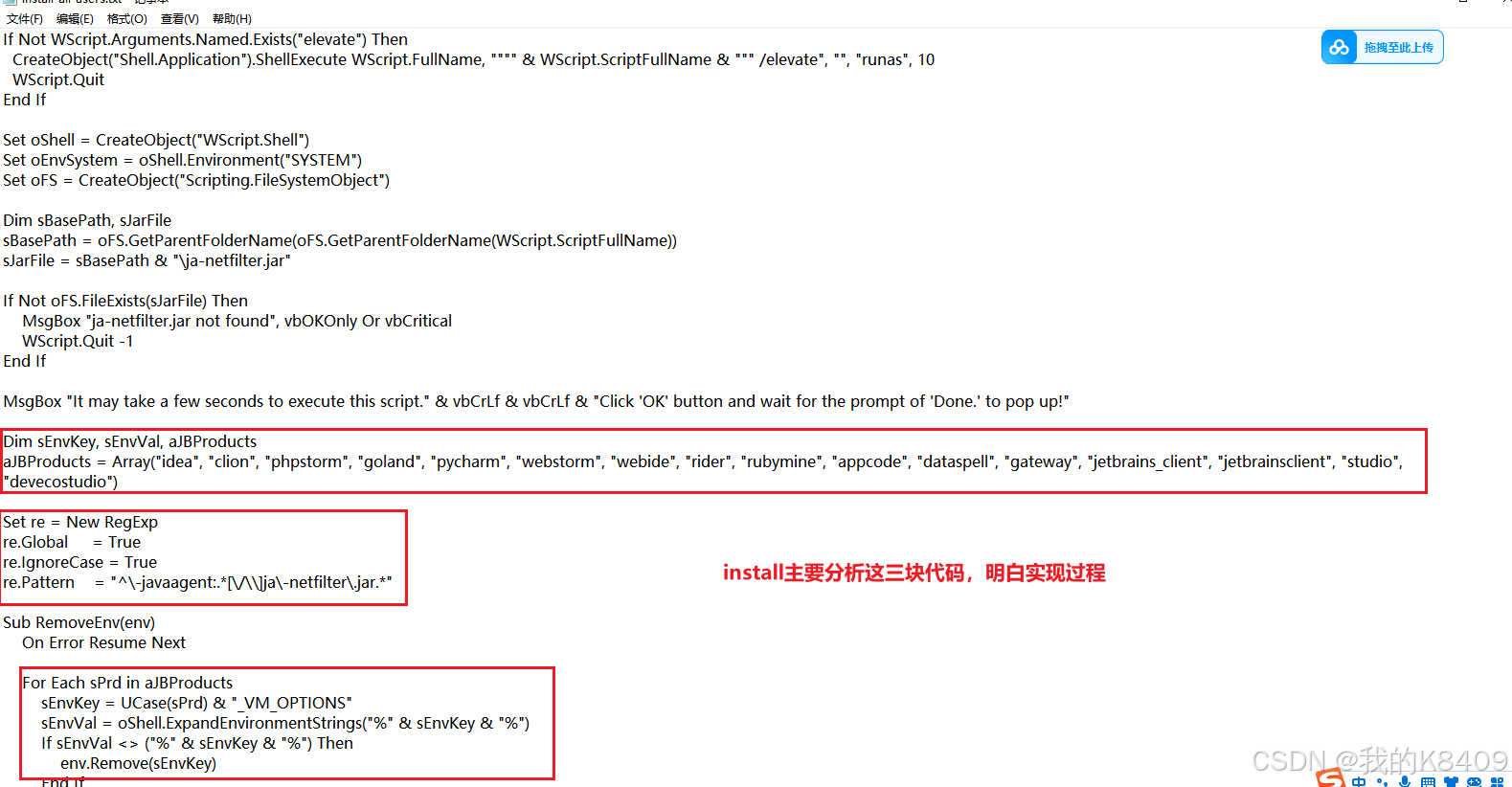 详解:破解JetBrains家族的全家桶,里面的脚本文件(有两个,一个是安装install,一个是卸载uninstall),先解析:uninstall,为了破解方便,所以脚本源码里定义了一个数组,遍历环境变量的时候会逐个比较数组中的元素,这些元素就是jetbein公司的产品名称:idea,parcharm,datagrip等,避免了之前某些产品被破解过,如果不删除旧的脚本变量就可能会产生冲突。当成功安装某个jetbein家族产品的时候,在执行脚本文件的时候,脚本是不会检测到你想破解的某个产品,uninstall是将之前所有被破解的而设置的脚本变量删除。