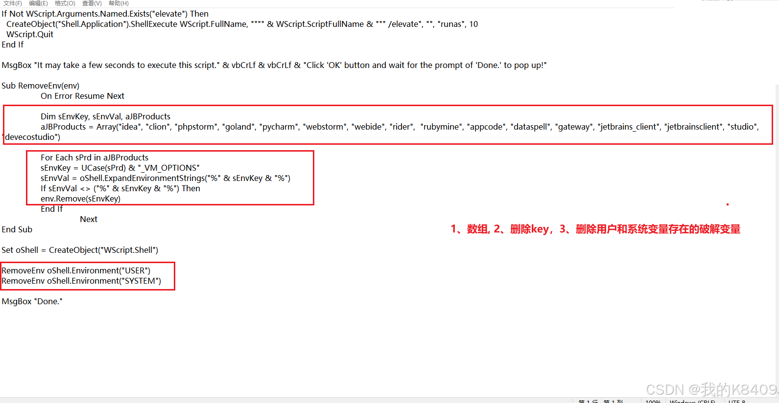 简述:在安装datagrip后,修改idea的scripts中install.vbs和uninstall.vbs两个脚本文件中的一个数组,去除datagrip这个元素,这样再破解idea的时候,就不会将之前datagrip的脚本文件所配置的环境变量删除,从而实现双破解。之前尝试过重装软件,这也是显然不行的,因为脚本代码执行,就检测破解的内容。(这里的install、uninstall是指install-all、uninstall-all、这个和install-current不同的是,这个all是包含所有用户,current只准对当前用户)