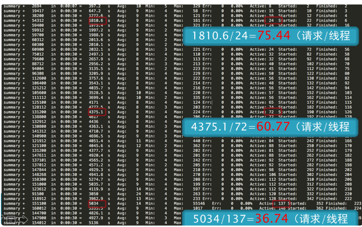其实我就是想告诉你,只要每线程每秒的 TPS 开始变少,就意味着性能瓶颈已经出现了。