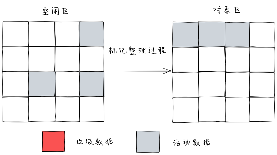 标记完成后,存活的对象被复制到空闲区域,并且将他们有序的排列一遍。