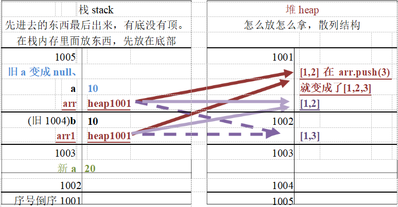 答案:arr = [1,3];是新建了一个新的房间。arr1 是 1,2,现在是插入新引入值”房间”,会在堆里面重新申请一间房,并指向新房间
