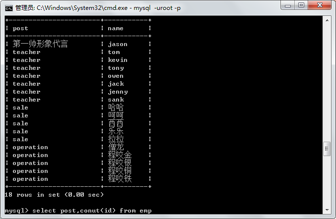('哈哈','female',48,'20150311','sale',3000.13,402,2),#以下是销售部门