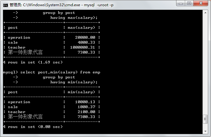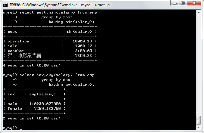 having avg(salary) >10000 # 分组后使用