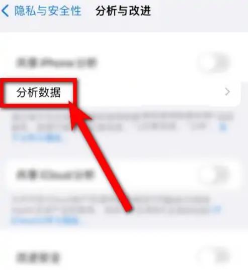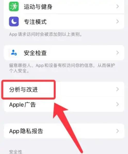 2.在隐私与安全界面,点击分析与改进,如下图。