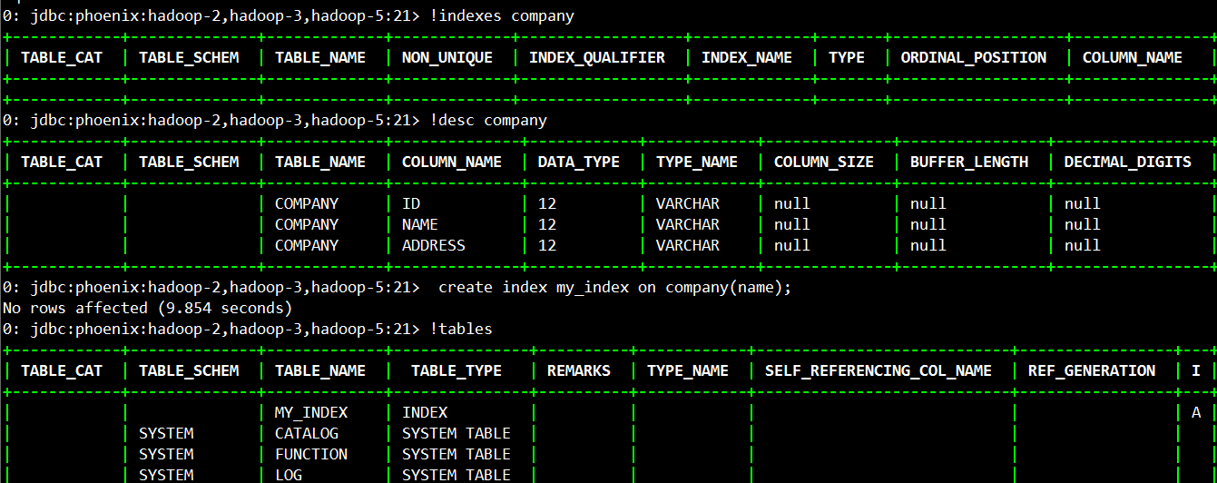 jdbc:phoenix:hadoop-5:2181> create index ZOO_index on ZOO9("f"."name","f"."address");