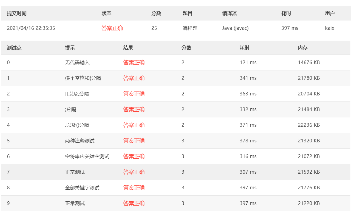 */ Map<String,Integer> mp=new TreeMap<String,Integer>(); for(String e:end) mp.put(e,0); String s=null; int flag=0;//检查是否有关键字出现过 StringBuilder t=new StringBuilder();//用来完成字符串拼接 while(!(s=in.nextLine().trim()).equals("exit")){ //有第一种注释符号,跳出 if(s.matches(".*//.*")) continue;//当然这里并不严谨,毕竟//注释可以放在有效代码后面 t.append(s+" ");//将该字符串与下一行字符串隔开 } //替换/**/ s=t.toString(); s=change(s);//要过最后一个测试点的特殊处理