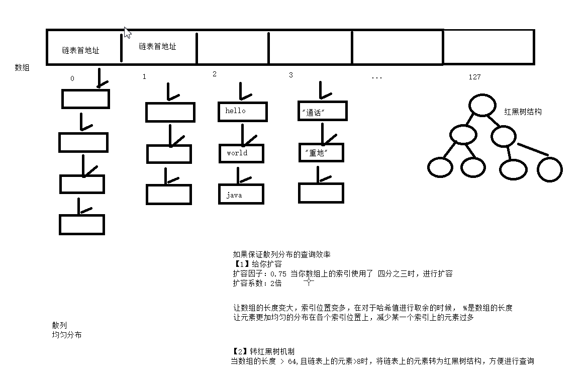 1.每当有元素要存入时,使用这个元素的哈希值取余%这个地址数组的长度,进入对应的索引