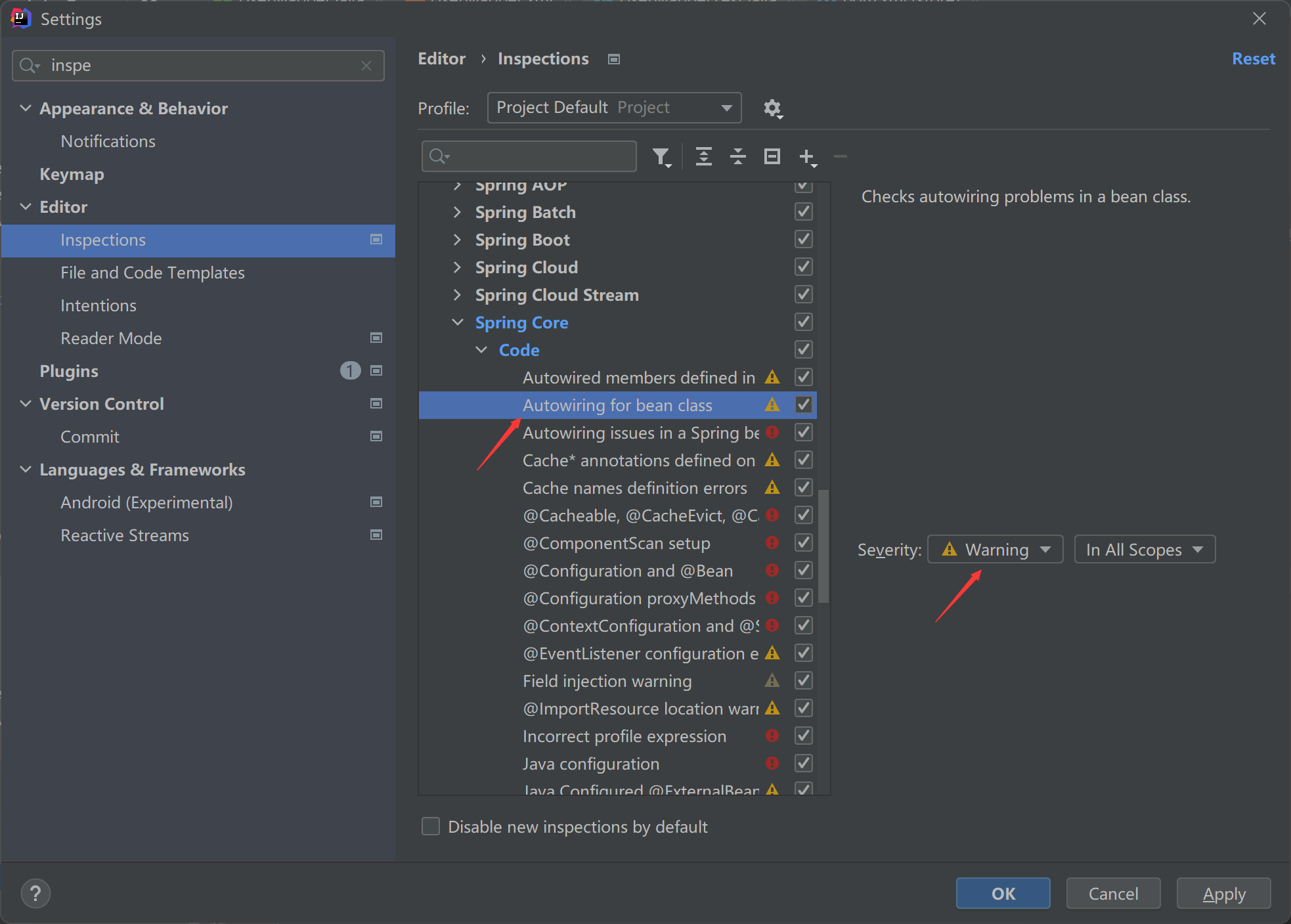解决:将Autowiring for bean class选项下的Severity设置为Warning即可。
