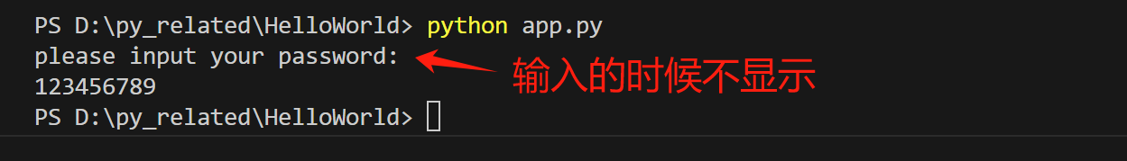 input 在接收输入的时候,是可以看到你输入的值的。如果是输入密码,不想让别人看到你的密码,怎么办呢,就需要用到一个标准库,getpass,标准库就是不需要你再去安装,装完 python 就有的库,就是标准库,getpass 就是一个标准库,导入进来之后,直接使用 getpass.getpass 方法就可以在输入的时候,不会显示了:
