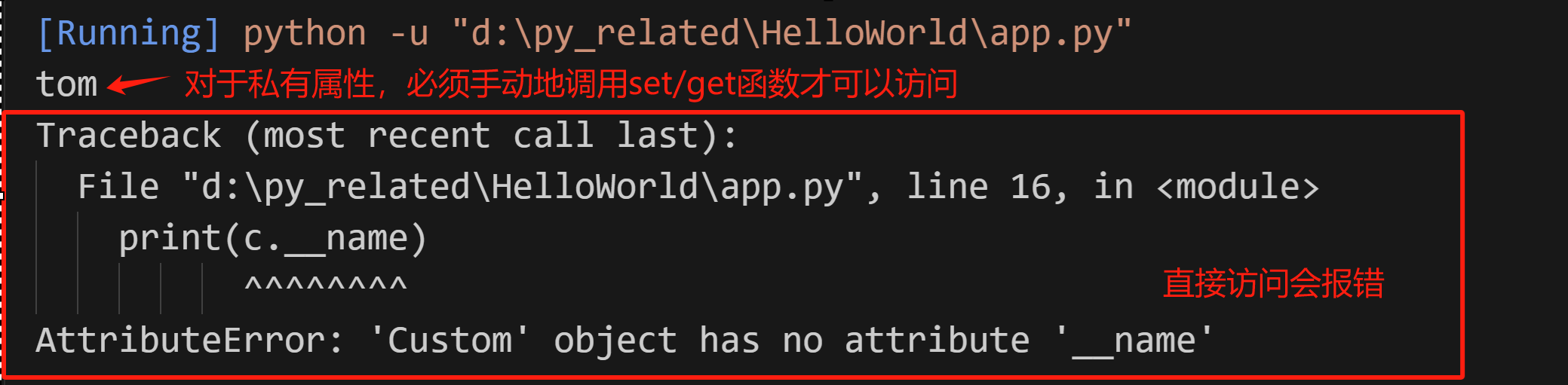 私有属性不能直接从类的外部访问它们。如果尝试这样做,Python会抛出一个AttributeError。类似于java类中的私有属性,可以自己编写set/get方法来访问和修改