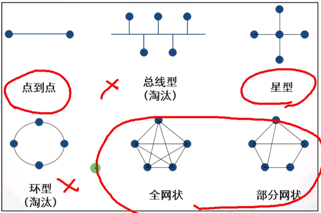 拓扑类型有:点到点、总线型(淘汰)、星型、环型(淘汰)、全网状、部分网状