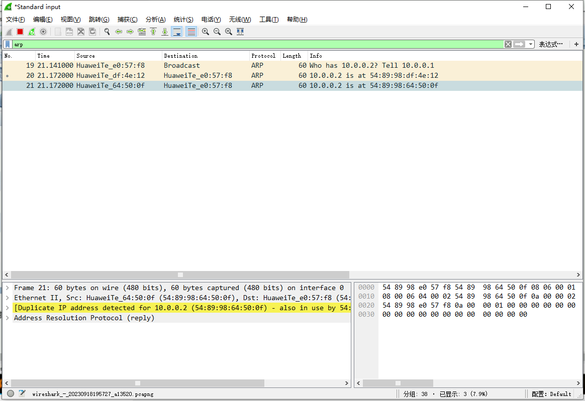 你会发现,有两台机器是同一个IP,但是MAC地址却不一样,第二个回应者,就是欺骗者。