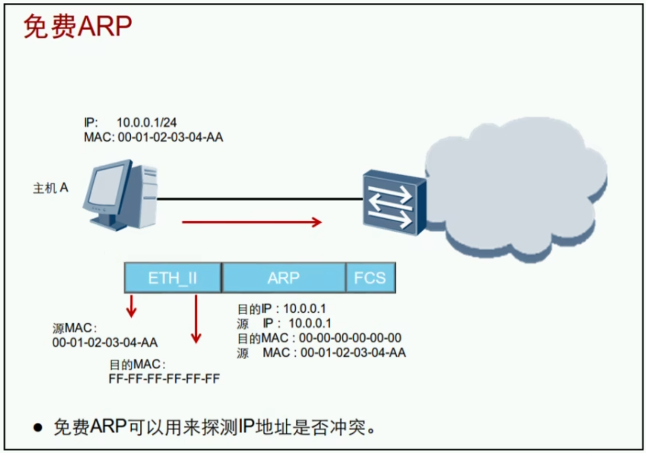 免费ARP用于探测自身IP地址是否被其他人使用,用于检测IP冲突